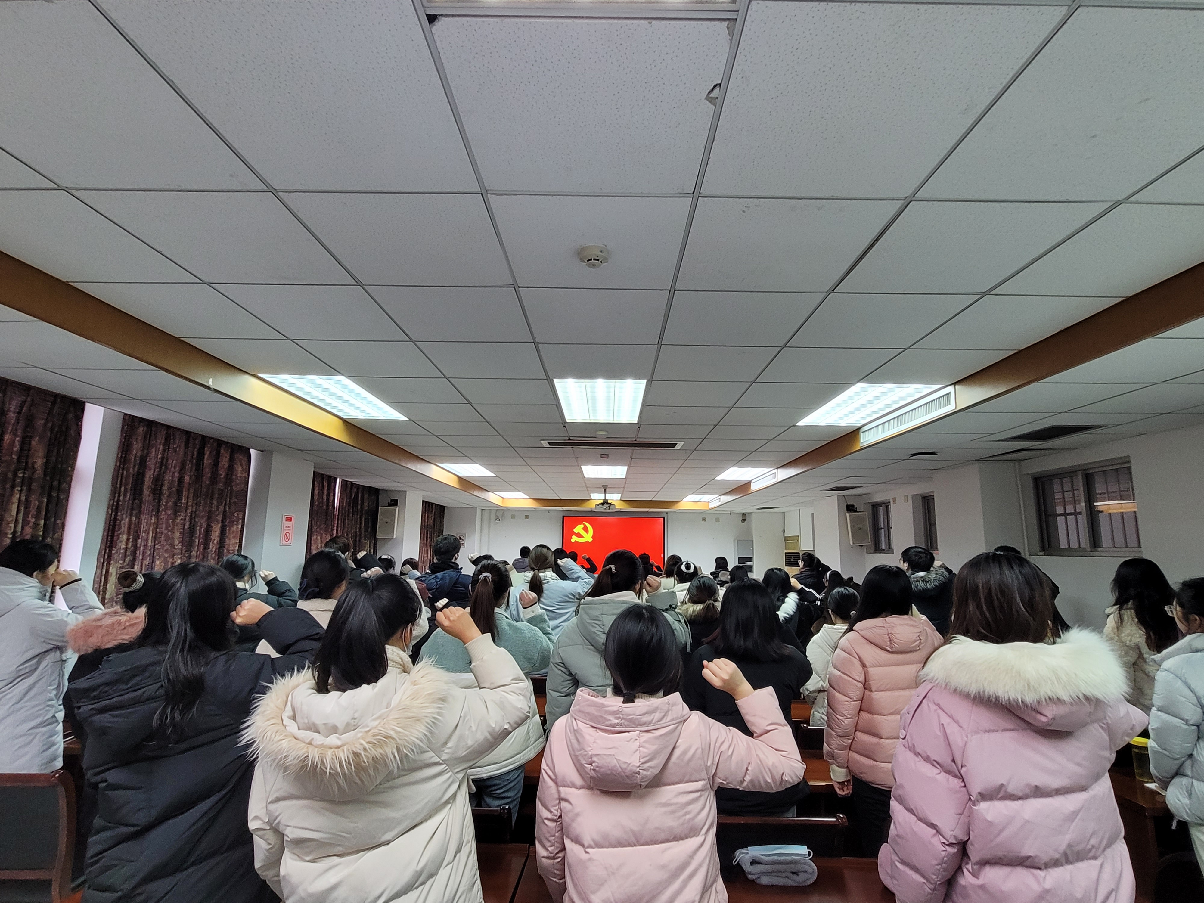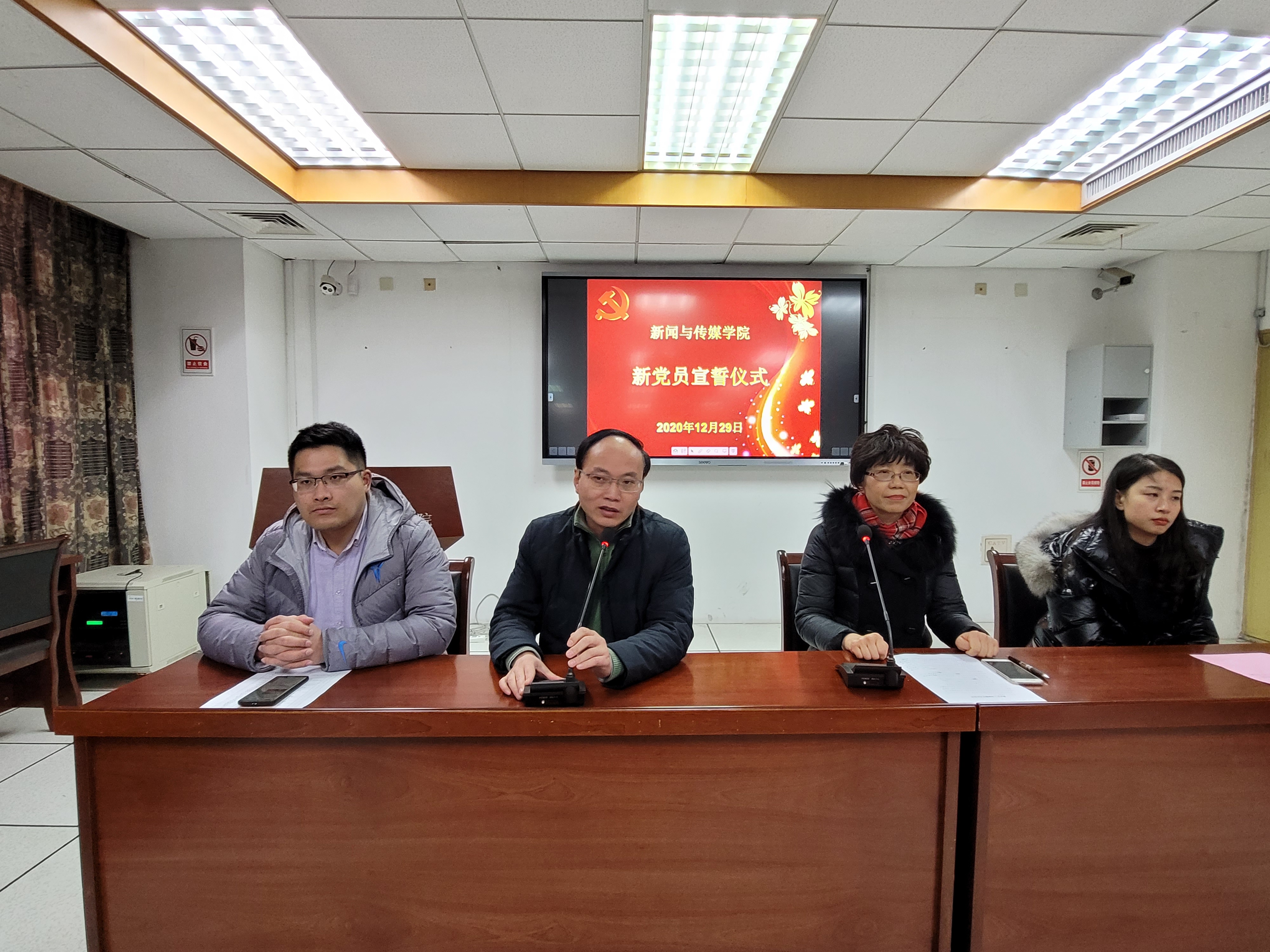 12月29日下午,学院党委在教学主楼1113举行新党员入党宣誓仪式暨集体谈话。院党委副书记刘长平、院党委组织员张怀宇、院团委副书记(学工办副主任)陈琨、学工办辅导员徐飞老师以及46名新发展的党员参加活动。