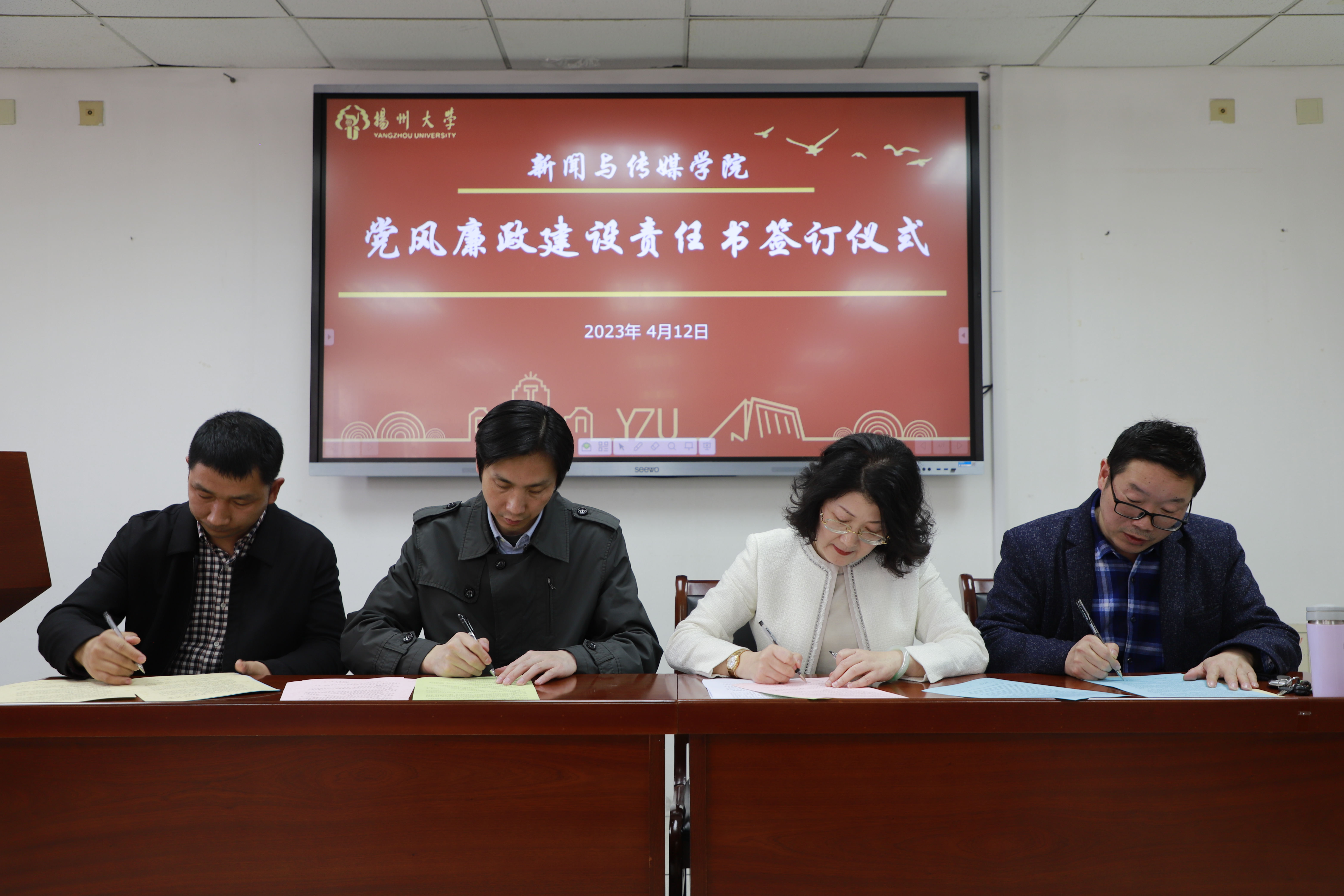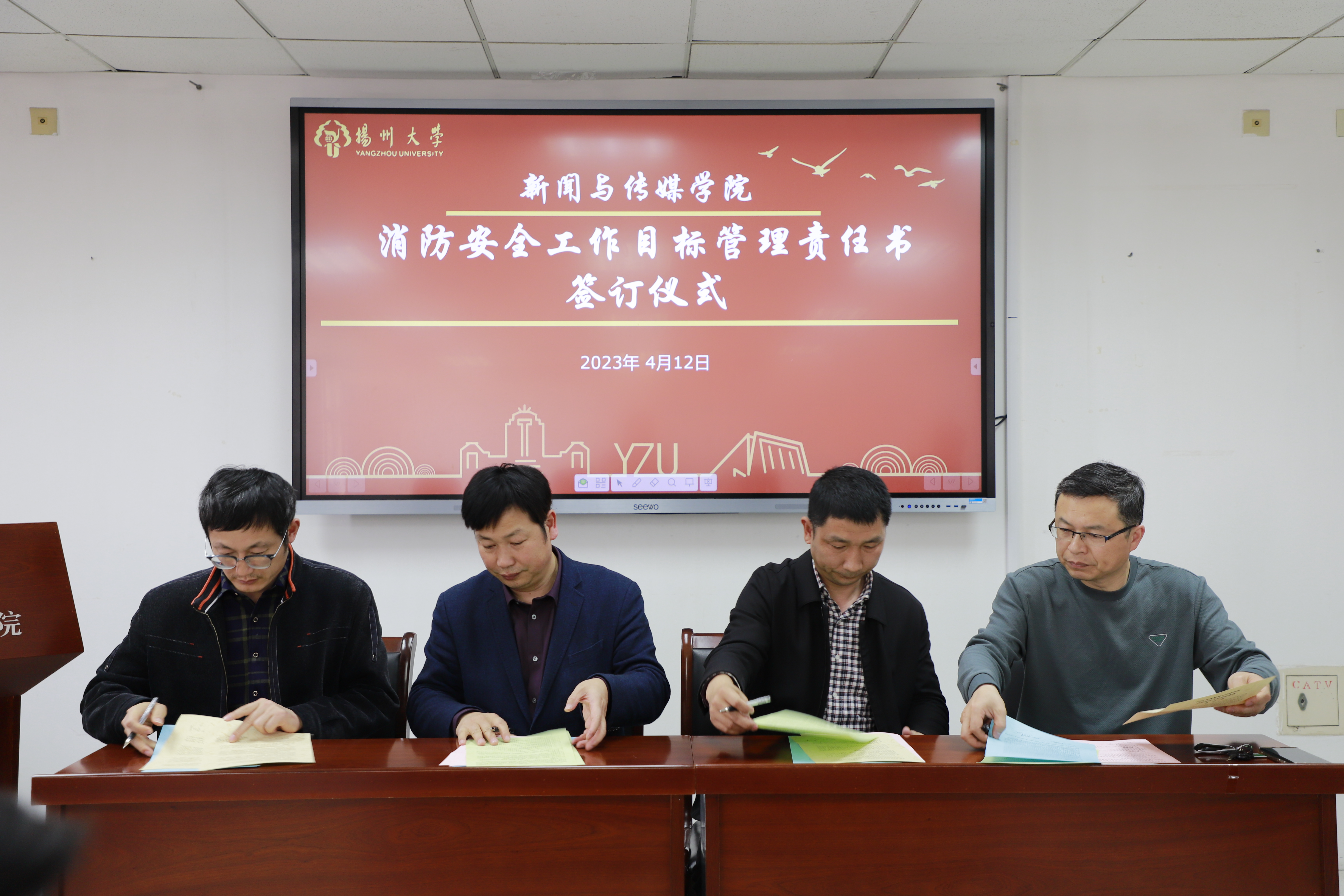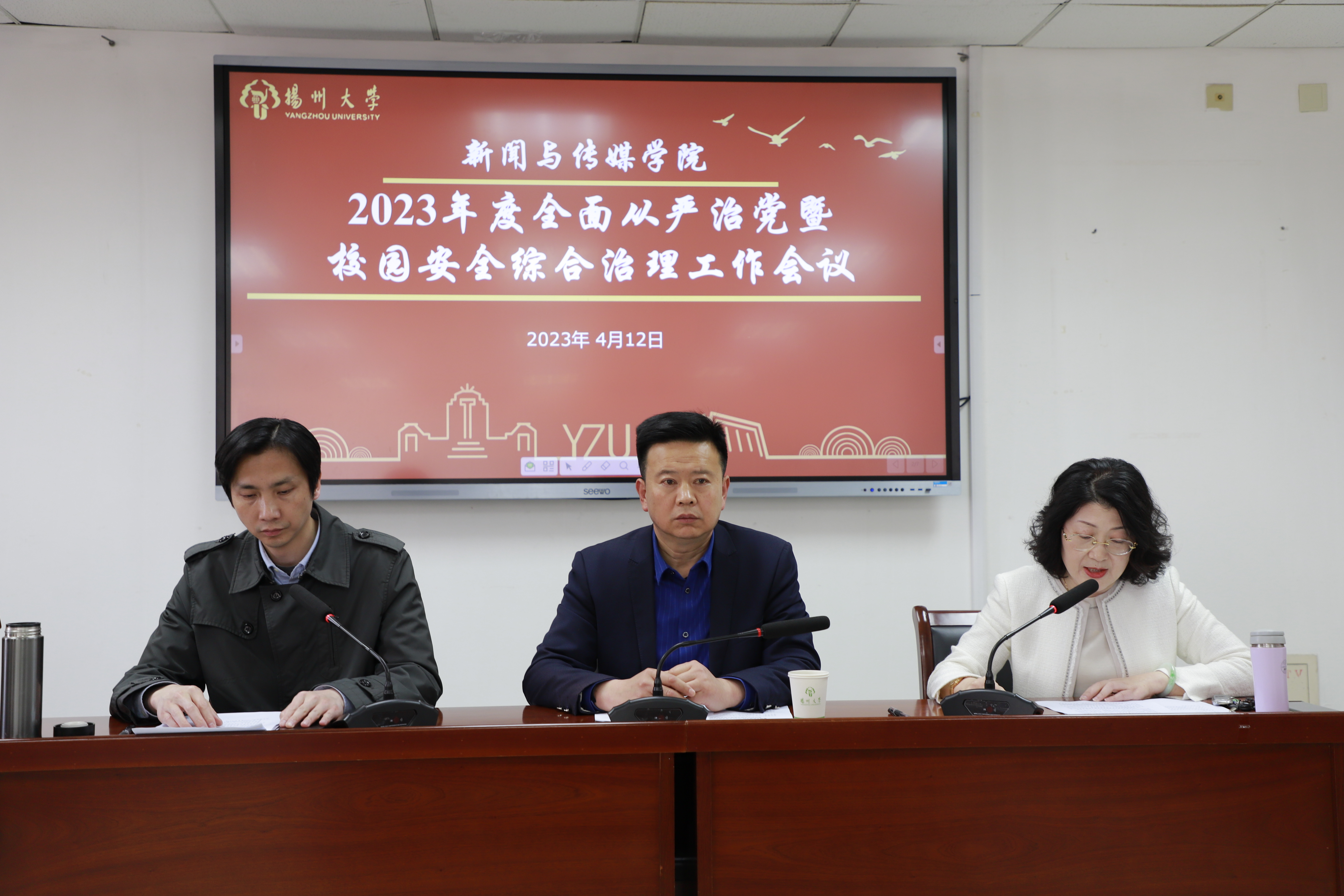 会上,党委副书记、纪检委员刘长平传达了扬州大学2023年全面从严治党工作会议精神,副院长秦宗财传达了2023年校园安全综合治理工作会议精神。根据学院责任网络,全体院领导分别与责任对象签订了党风廉政建设责任书、意识形态工作责任书、消防安全管理责任书和校园安全综合治理工作目标管理责任书。
