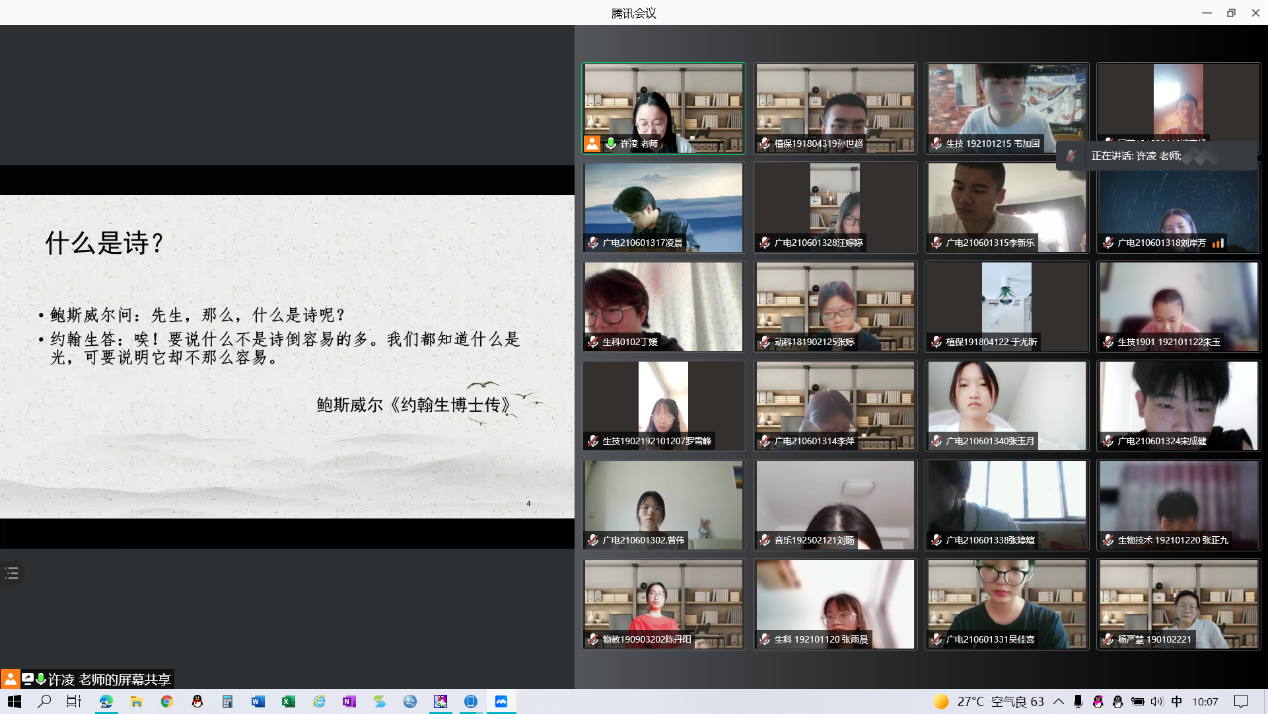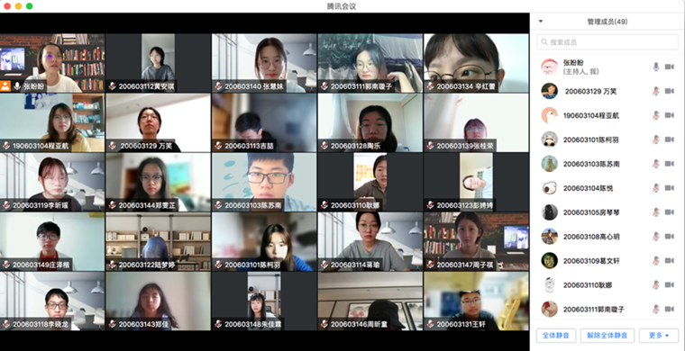 “云”上相见,充满期盼。9月13日,线上教学第一天,任课教师和学生们,早早进入线上课堂。教师查看学生人数,调试上课课件,熟悉教学环境。导入、讲解、提问、小结、作业,教学环节完备,教学秩序井然。老师准备充分,教学内容丰富,学生听课认真,师生情绪饱满。