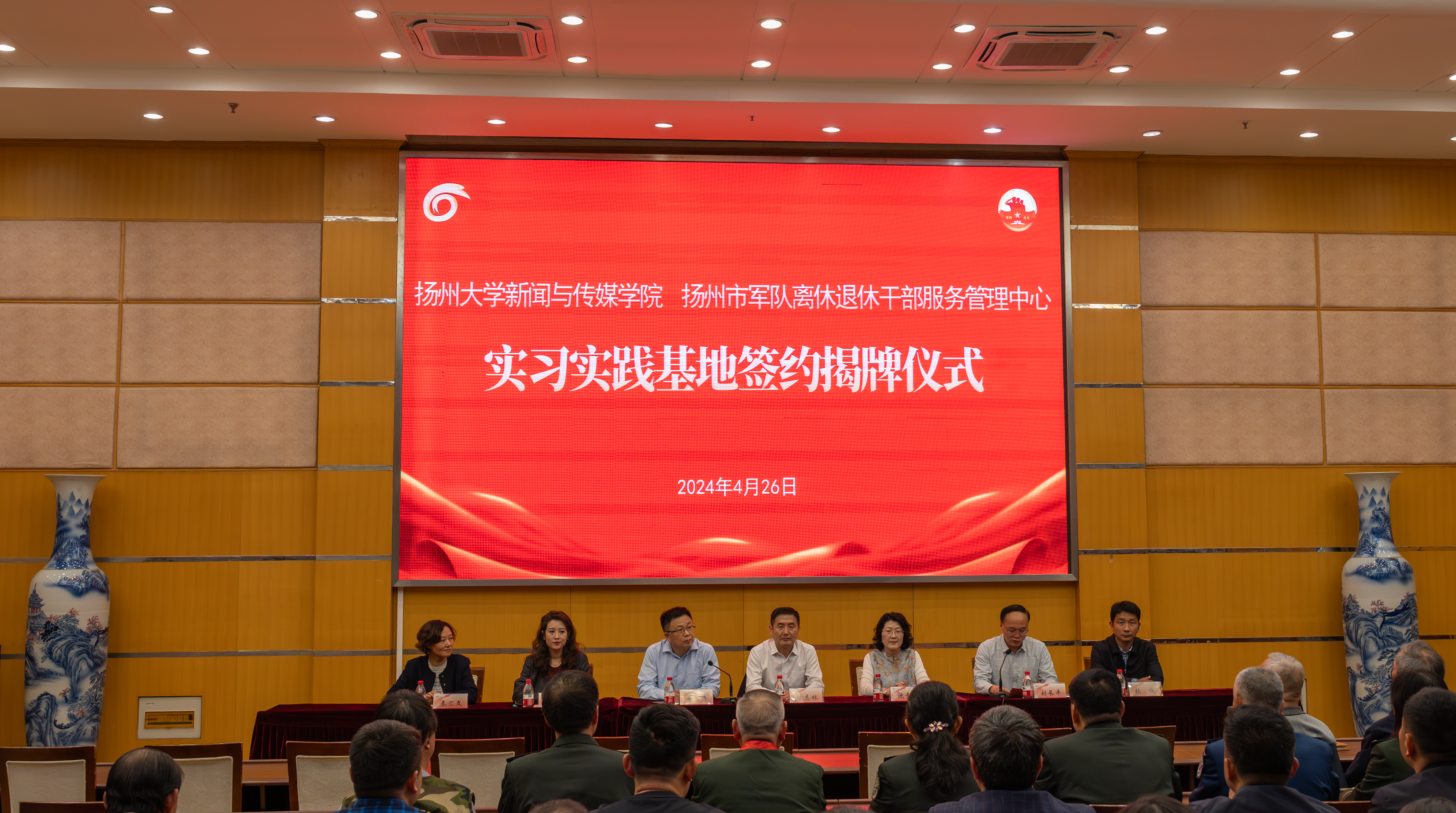 4月26日,我院与扬州市军队离休退休干部服务管理中心合作共建实习实践基地签约授牌仪式在荷花池校区主楼二楼多功能厅举行。扬州市退役军人事务局党组书记、局长陆志林,扬州市退役军人事务局党组成员、副局长翟江淮,新闻与传媒学院党委书记沈意文,党委副书记刘长平,副院长张诚出席活动。扬州市军休中心、学院师生代表150余人参加活动。
