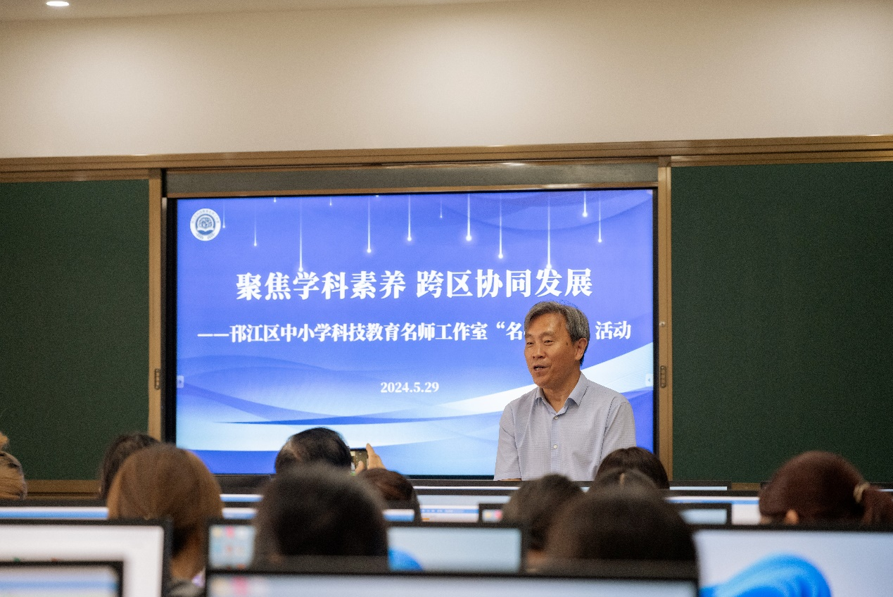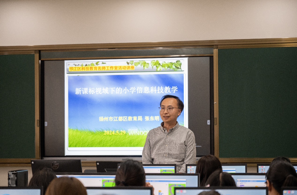 扬州市江都区教育局的张东明老师以《新课标视域下的小学信息科学教学》为主题开展了专题讲座。他从课程标准中的核心素养角度出发,就教资考核、学科教育理念、关键词与八大核心、逻辑主线等方面跟大家做了详细分享,并指出要”像科学家那样思考“。