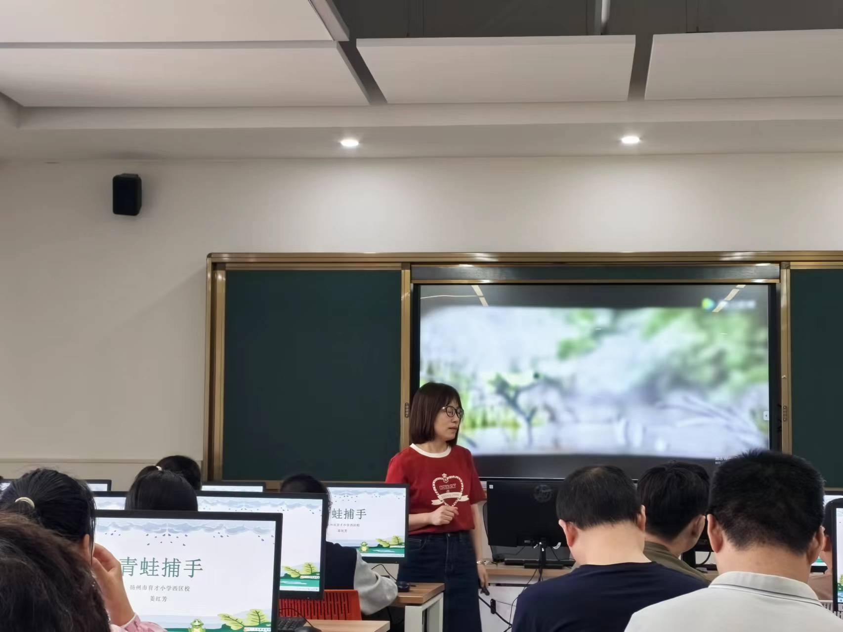 第一节示范课是扬州市育才小学西校区姜红芳老师带来的Scratch编程主题课《青蛙捕手》。这节课以有趣的青蛙捕虫视频导入,首先进行思维建构,明确角色及其状态动作,然后引导学生逐步进行创作实践,通过丰富的师生互动实现教学目标达成,最后进行拓展创新。