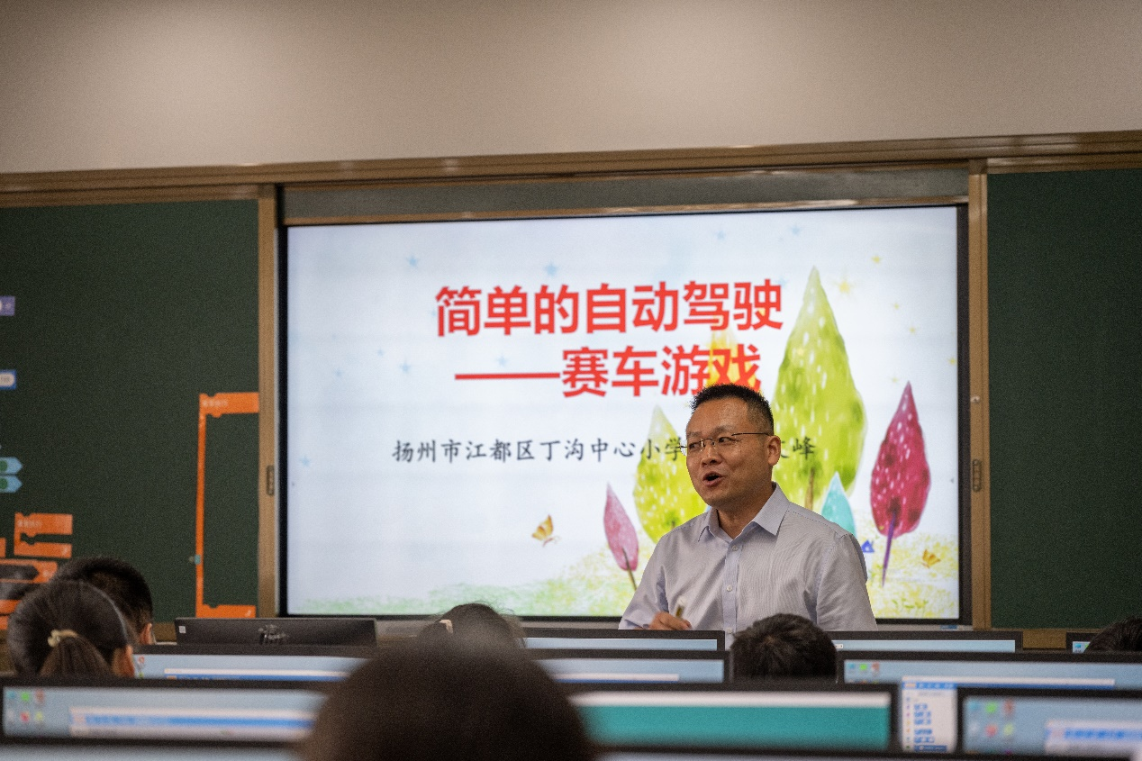 第二节示范课是扬州市江都区丁沟中心小学高文峰老师带来的《简单的自动驾驶—赛车游戏》。这节课基于协作学习的设计思路,开展了精彩的小组学习活动,并通过积分比赛有效激发学习动机,课堂内容紧凑,任务明确,学生经过模仿-修改-调试-验证,积极参与课堂教学和小组互助,有效完成了课堂教学任务。