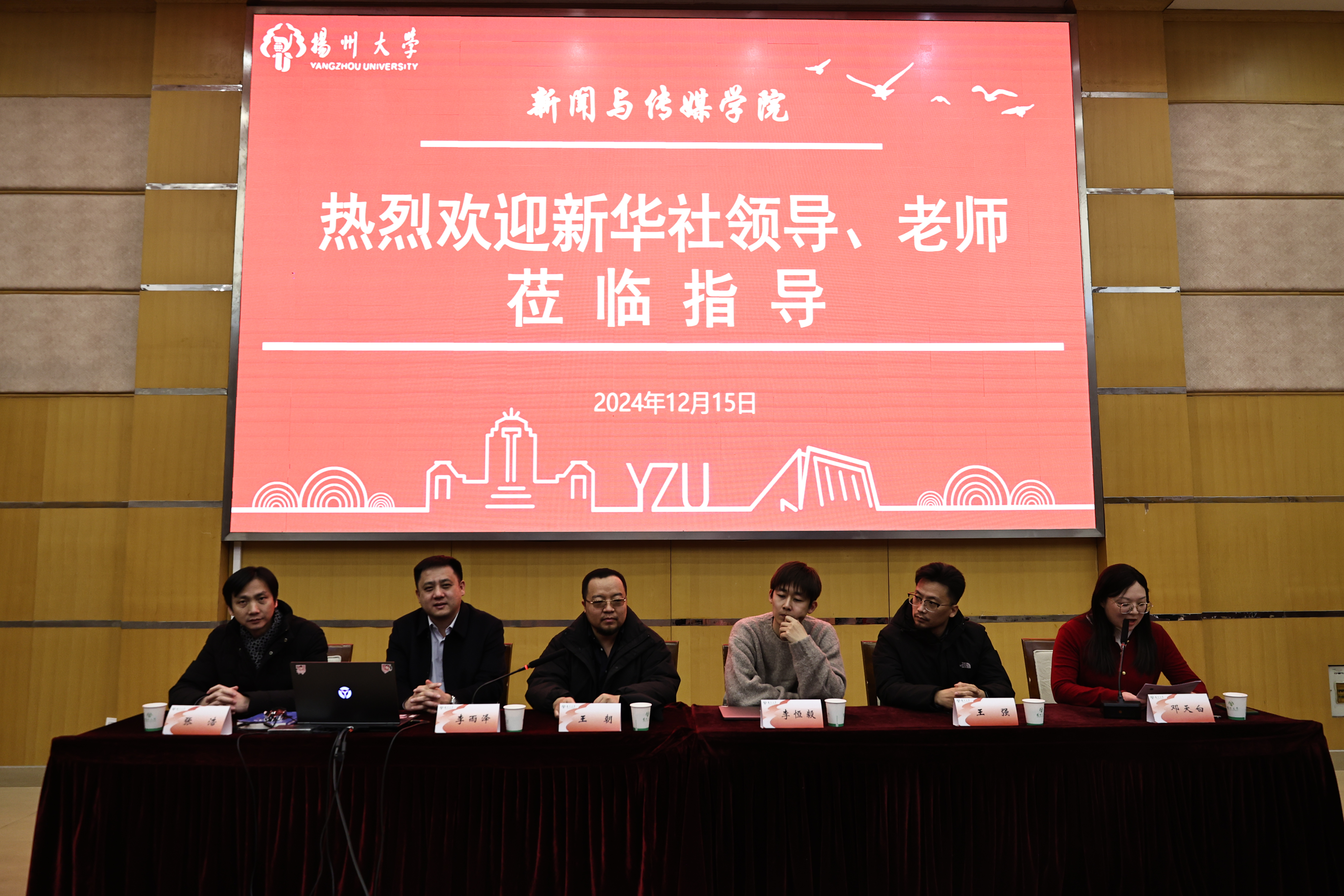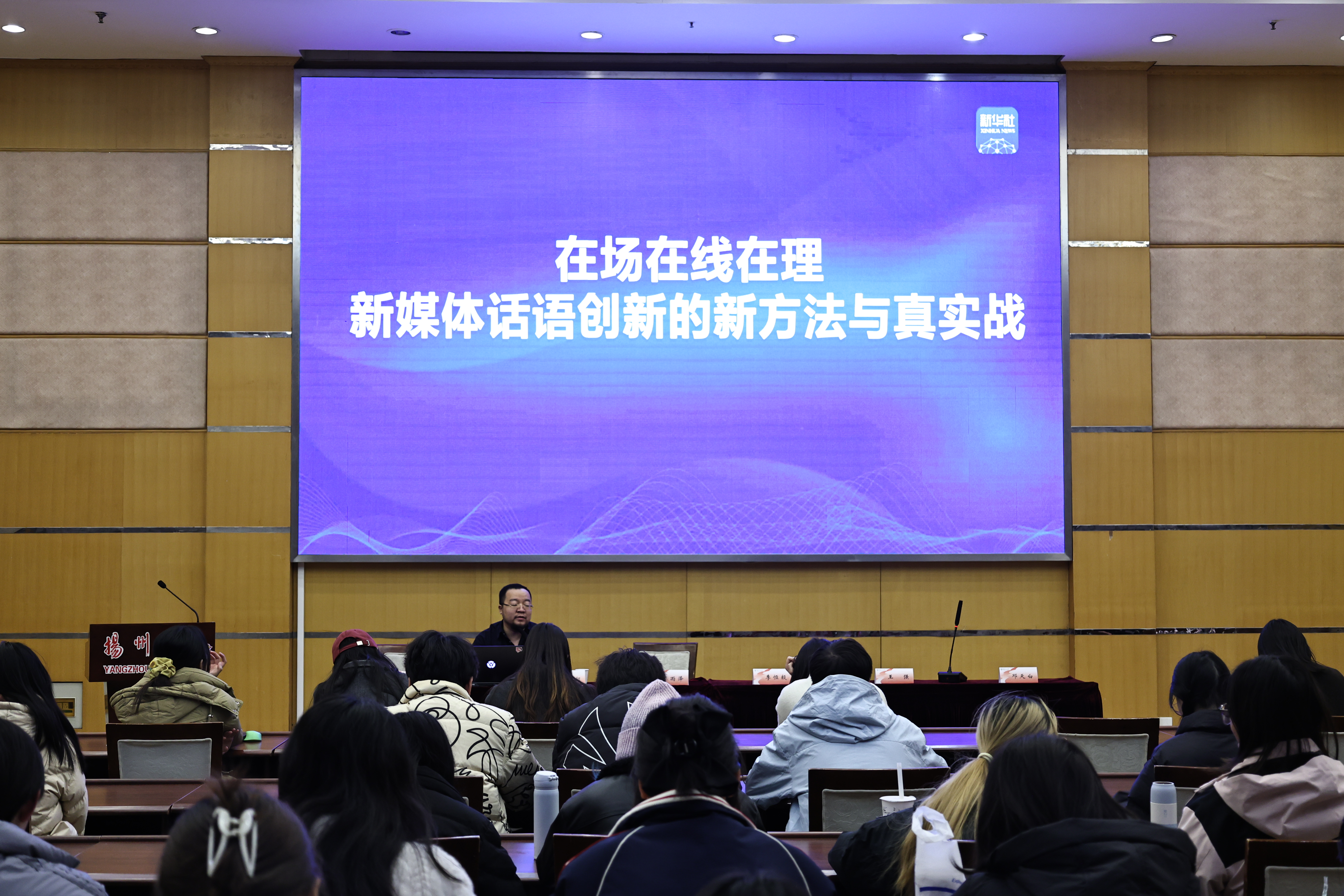 2024年12月15日下午,我院在荷花池校区教学主楼二楼多功能报告厅举办了新华社江苏分社与扬州大学共建“全媒体创新班”的专题讲座——“新媒体策划、制作及话语创新”。本次讲座由新华社音视频部视频新媒体中心编辑李恒毅和新媒体端口骨干编辑主讲。新华社新闻信息中心江苏中心副主任李雨泽、新华社新闻信息中心江苏中心新闻供稿部总监王强、院长张浩、副院长张诚、全媒体创新班班主任董熠老师及师生代表150余人参加了本次活动。活动由创新班联络人邓天白主持。