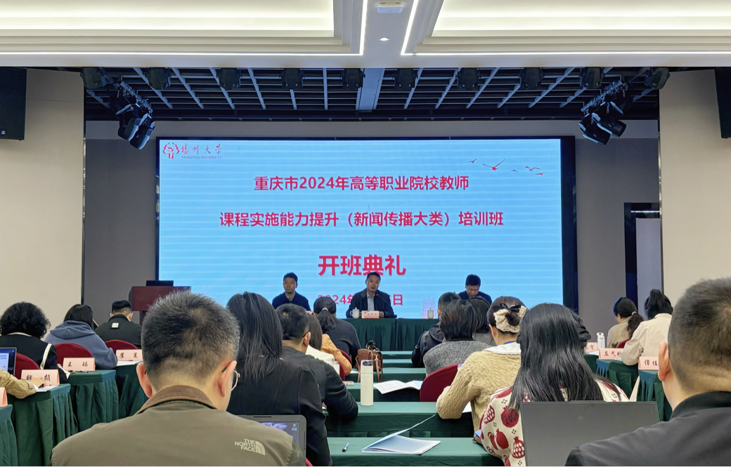 2024年11月5日上午,由扬州大学承办的重庆市2024年高等职业院校教师课程实施能力提升(新闻传播大类)培训顺利开班。校继续教育学院副院长洪秀兵,副院长秦宗财、张诚,以及来自重庆市各高职院校的37名骨干教师出席了开班仪式。开班仪式由张诚主持。
