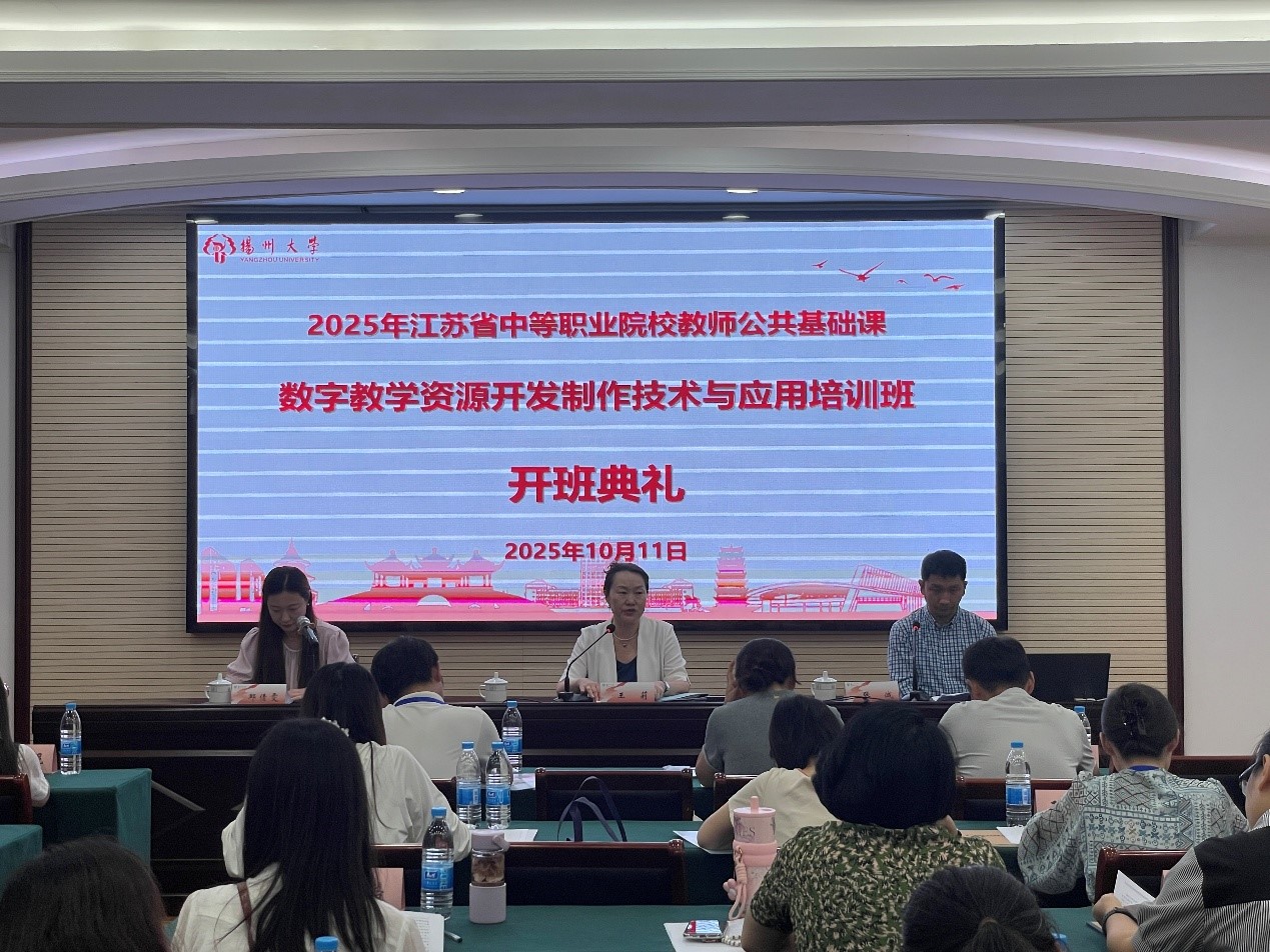 2025年10月11日下午,由扬州大学承办的“2025年江苏省职业院校教师素质提高计划——公共基础课数字教学资源开发制作技术与应用培训”开班仪式在扬州大学田园宾馆隆重举行。扬州大学继续教育学院副院长王莉、扬州大学新闻与传媒学院副院长张诚、培训班主任徐娟以及来自江苏省内各中职学校的39名骨干教师参加了开班仪式。仪式由新闻与传媒学院办公室主任邱倩雯主持。