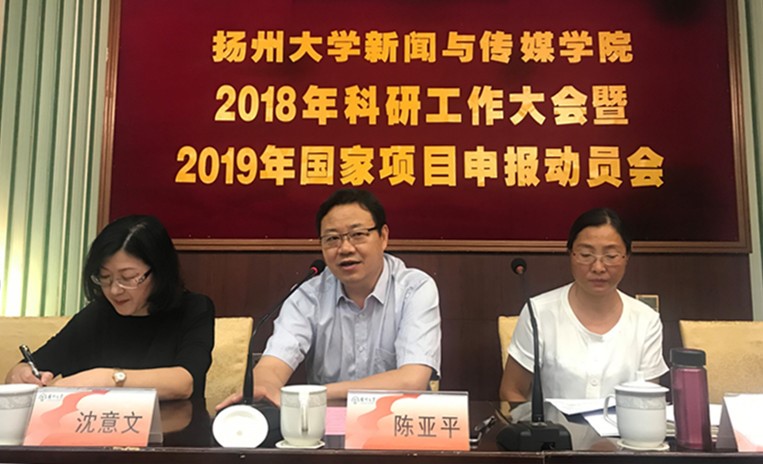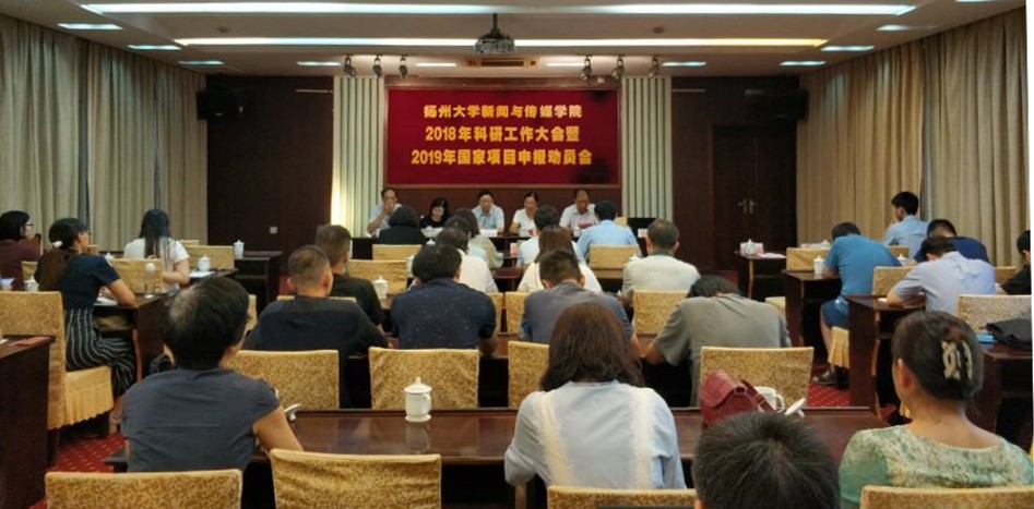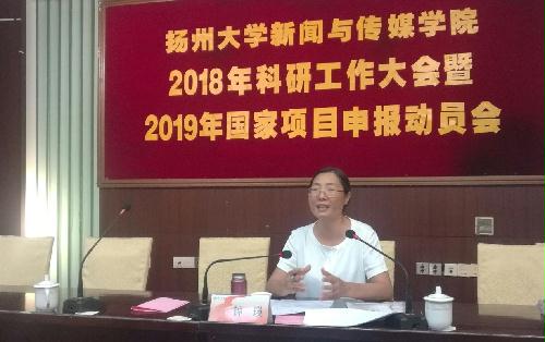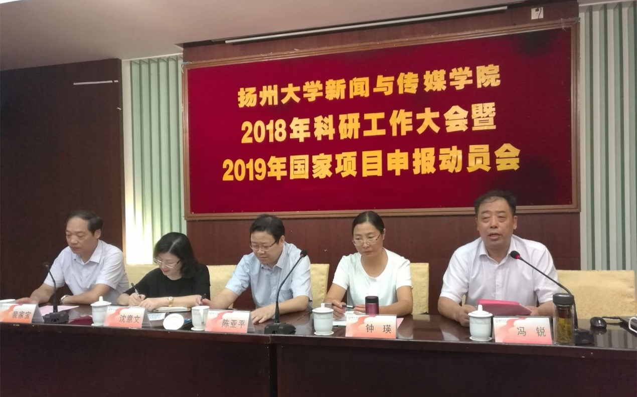 2018年9月2日上午8点30分,学院在虹桥专家楼三楼大会议室召开了新闻与传媒学院2018年科研工作大会暨2019年国家项目申报动员会。国家社科基金终审专家、华中科技大学新闻与信息传播学院副院长、博士生导师钟瑛教授、扬州大学党委常委、副校长陈亚平教授、校人文社科处沈意文副处长、新闻与传媒学院全体院领导和教职员工参加了此次会议。