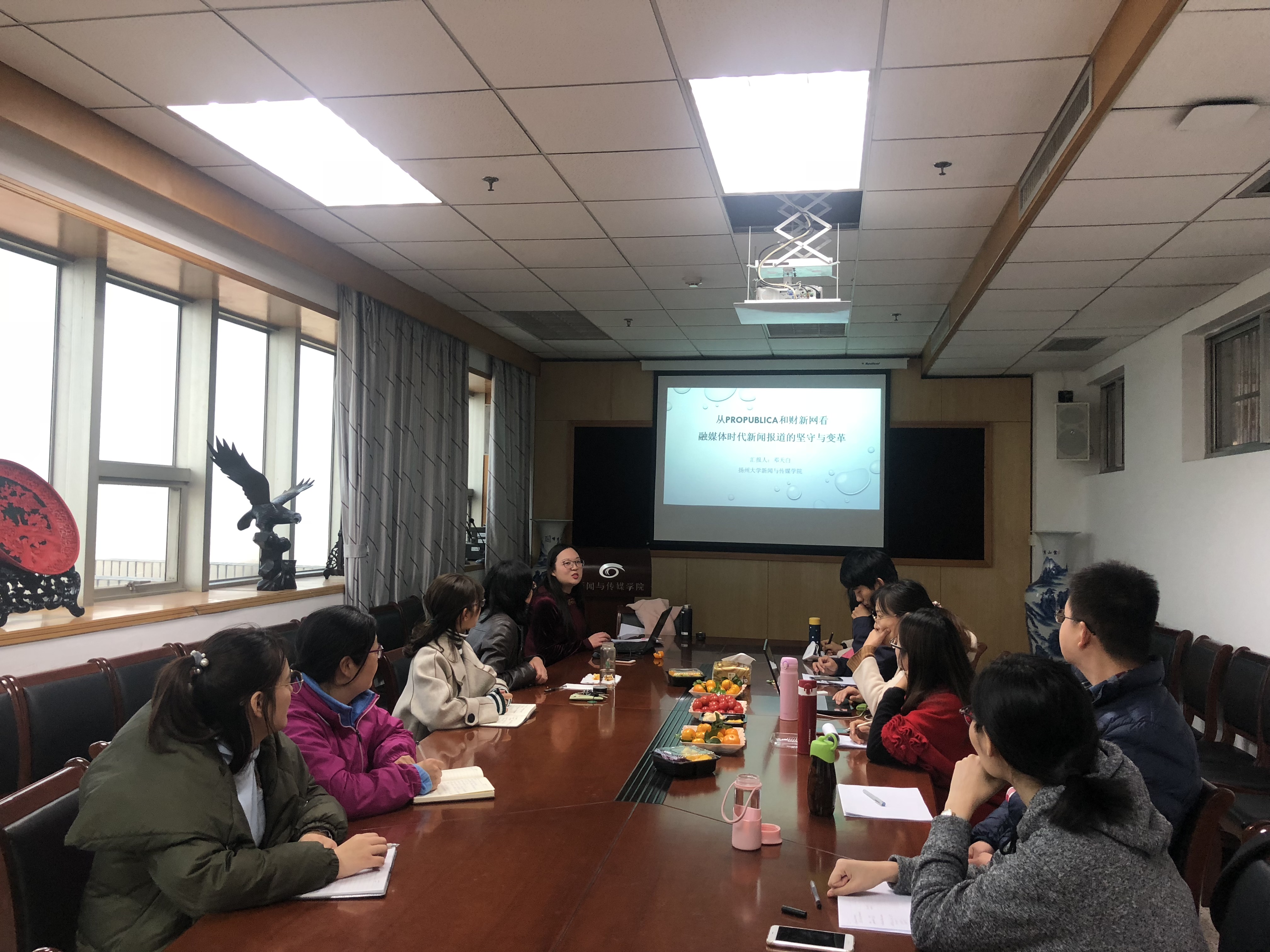 邓天白博士报告的题目是《从ProPublica和财新网看融媒体时代新闻报道的坚守与变革》。该报告结合《新媒体时代调查性报道的坚守与变革——从2017年ProPublica主要获奖作品谈起》(2018年刊出在《新闻与写作》),以及正在修改中的《融媒体时代中国环境新闻叙事的创新实践——以财新网“数字说”为例》两篇论文来探讨融媒体时代新闻报道中坚守与变革。报告从选题内容、呈现形式与生产模式层面,探讨ProPublica在保证一定深度的新闻品质基础上,丰富选题类别,强化环境报道,运用地图新闻、数据新闻等技术创新手段满足受众的信息需求,完成由专业记者编辑主导向社会化协同报道的转变。