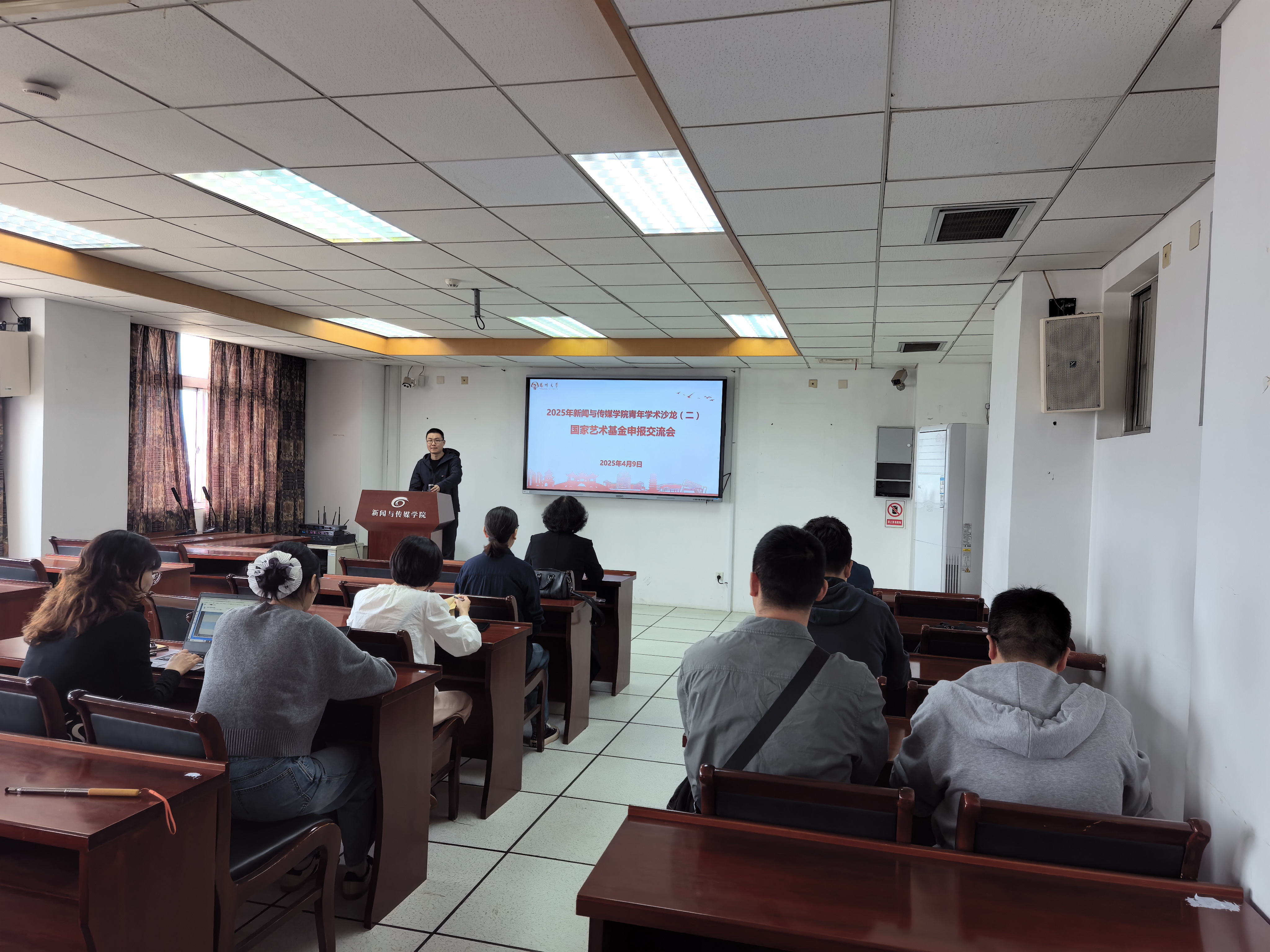 4月9日下午,我院于荷花池校区主楼1113会议室召开国家艺术基金申报交流会。本次会议由青年教师赵自然主讲,院长张浩、副院长秦宗财及我院部分青年教师参加会议。