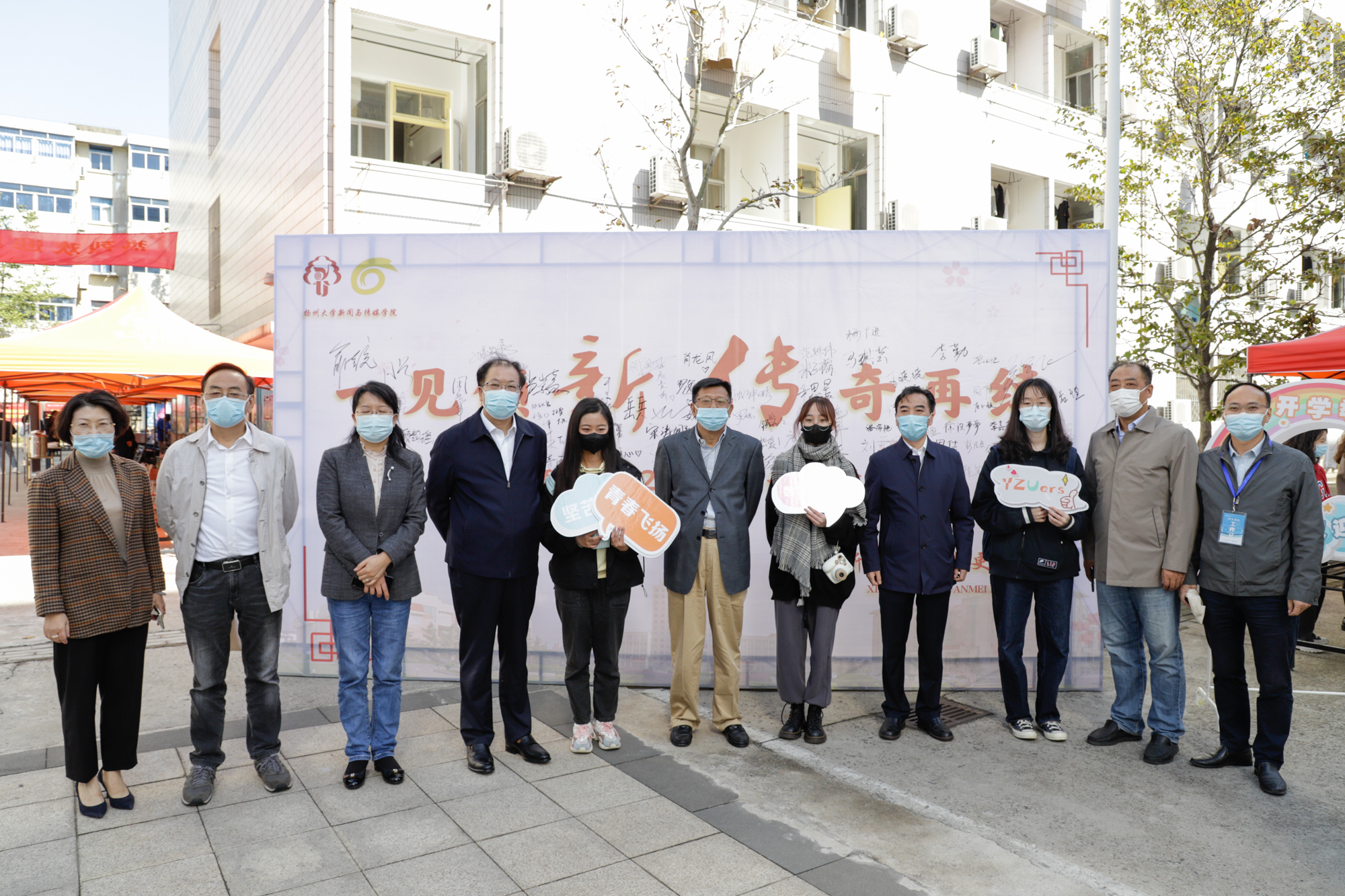 在荷花池校区学生宿舍区,校领导们饶有兴致地观摩了学院“签名墙留影”、入学惊喜盲盒、抖音直播迎新等学院特色活动,对学院重视学生专业技术培养,鼓励学生积极参与实践创作的做法表示赞赏。并在签名墙上签名留念,与现场师生亲切交流,勉励同学们找准目标定位,打好专业基础,不负美好时光,交上满意答卷。