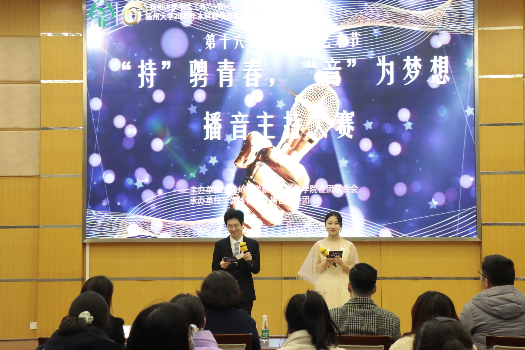 经过初赛选拔,来自各个学院的共十位参赛选手脱颖而出。决赛分为播音、主持两组,包含自我展示、现场评论和临场应变三个环节。经过激烈角逐,郑心怡同学获得了播音组的金话筒,王从健、皮阿琨并列获得播音组的银话筒;董昊宇、伏秋月、汪海瀛三位同学分别获得了主持组的金话筒、银话筒和铜话筒。