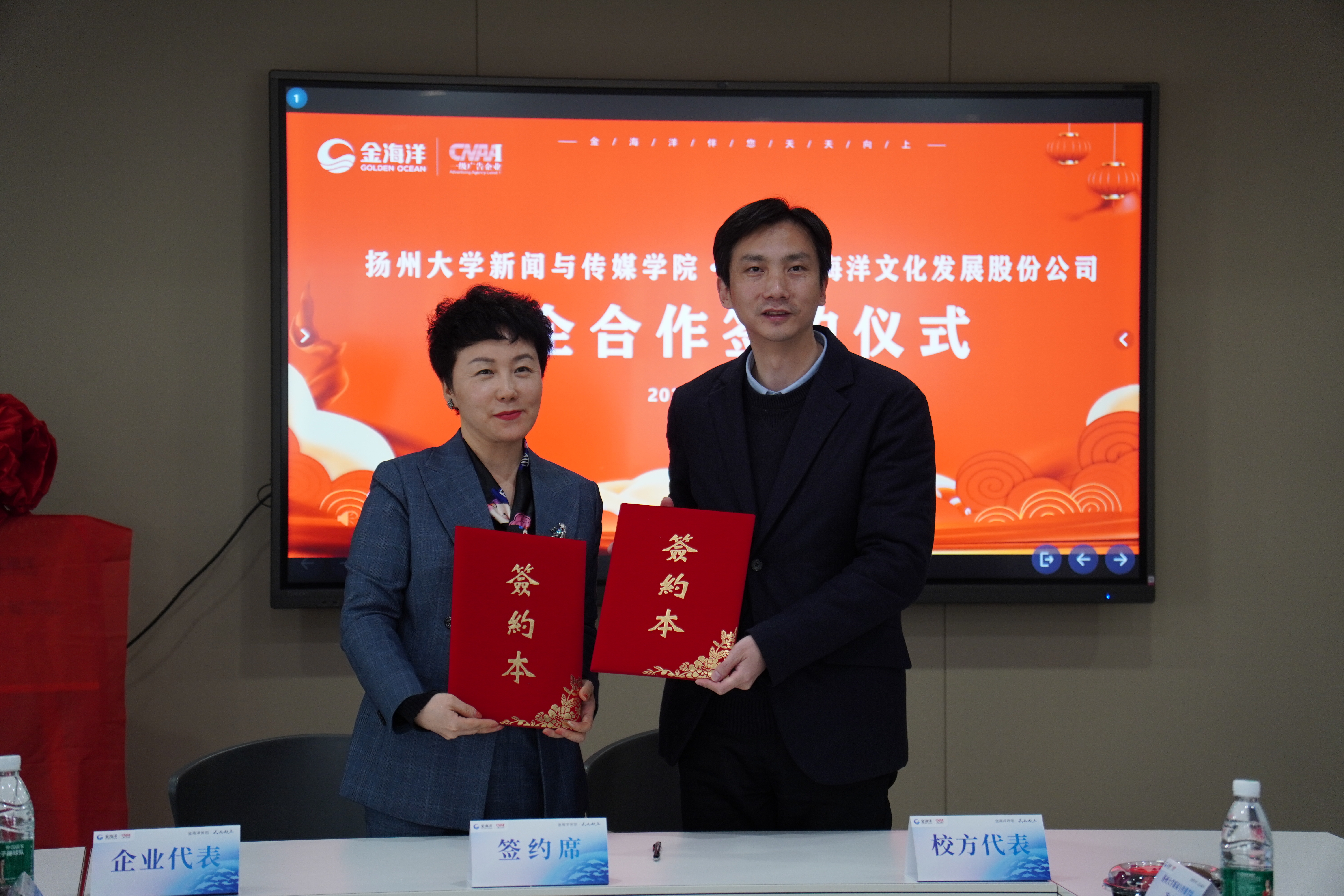 江苏金海洋互动城市文化发展股份有限公司董事长于海洋、媒介事业部总经理李静、全案事业部总经理王小丽、副总经理陈海清、行政总监纪哈杨等参加共建活动。校企双方就新媒体行业发展趋势、产学研用一体化、人才培养的产业导向、学生实习见习及岗位聘用等问题深入交换了意见。