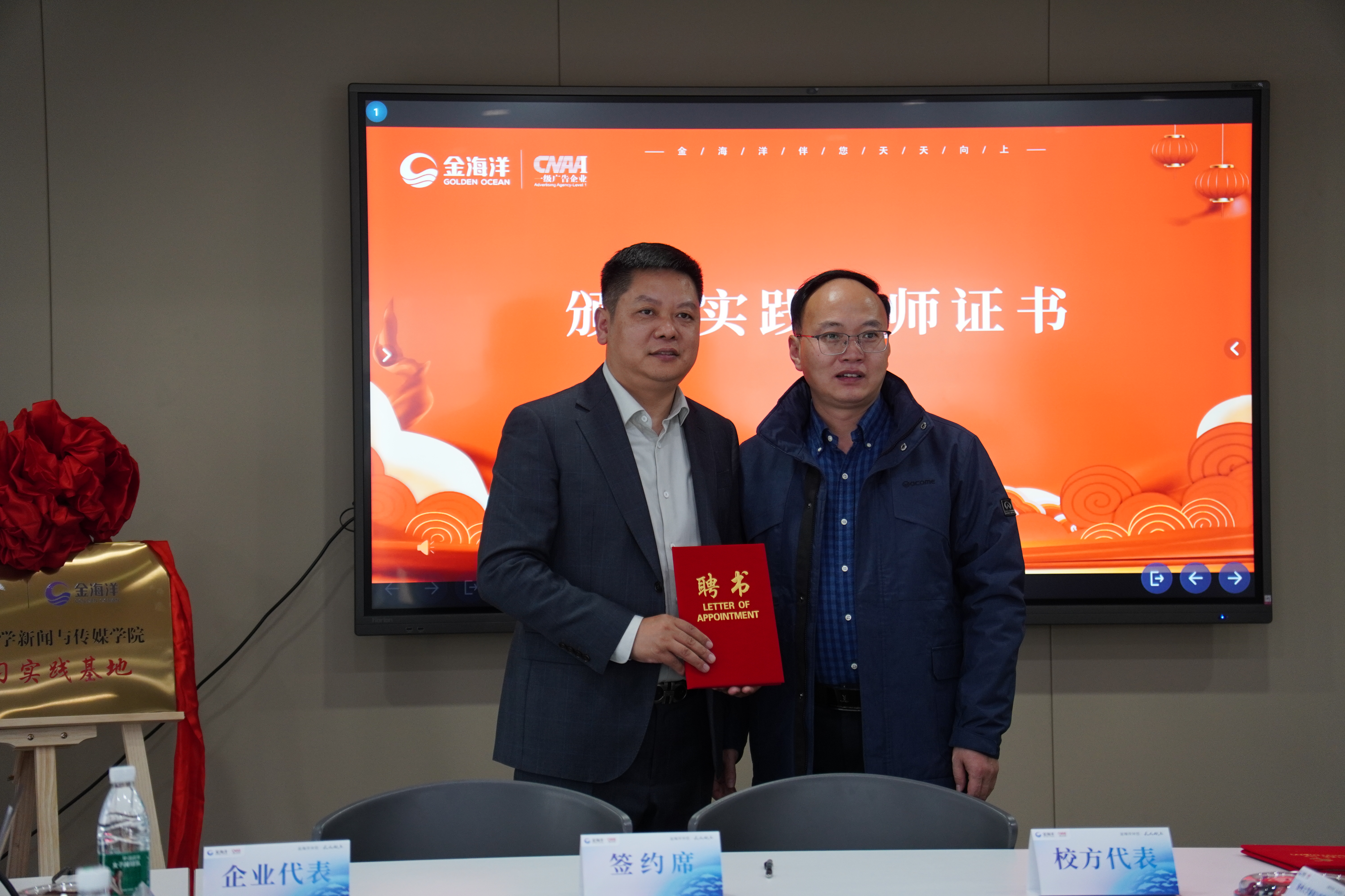 院党委书记沈意文和金海洋公司董事长于海洋为学院实习实践基地揭牌。校企双方签署了合作共建协议书,并颁发了实践导师证书。