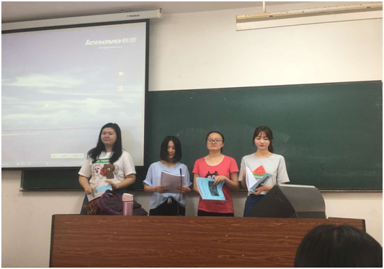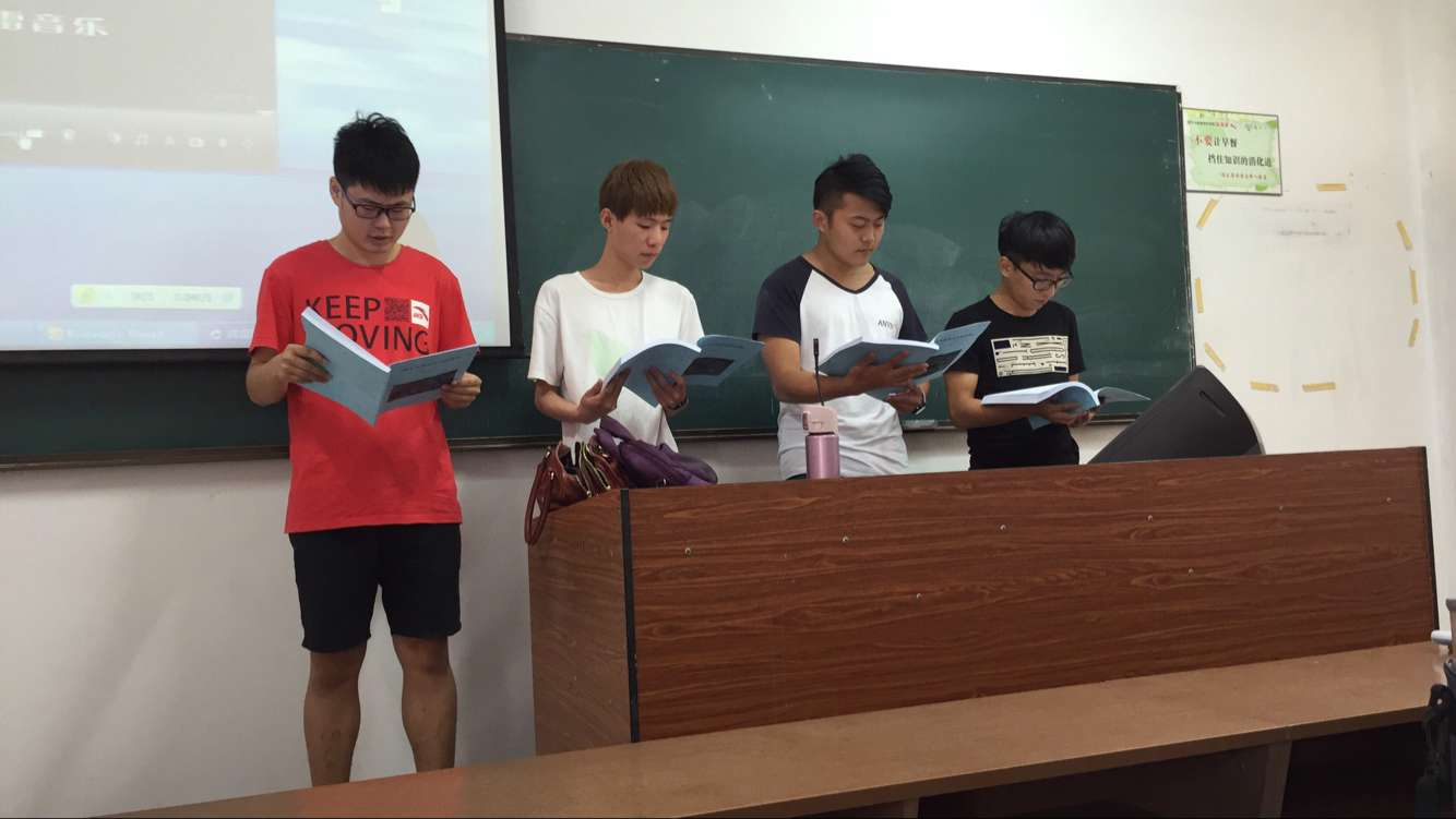 2016年9月22日,在张爱凤老师的播音主持课上,为了让同学们更好地体验朗诵的乐趣,在教同学们练声的同时也鼓励同学们每天朗诵一首自己喜欢的小诗歌,这样不仅可以练声带还可以提高同学们的文学修养。这一建议得到了同学们的一致认可,用当下流行的话来说就是“定下一个小目标——每天朗诵一首诗”。在课堂上,老师也选取了有代表的同学走上讲台朗诵,锻炼同学们的台风。