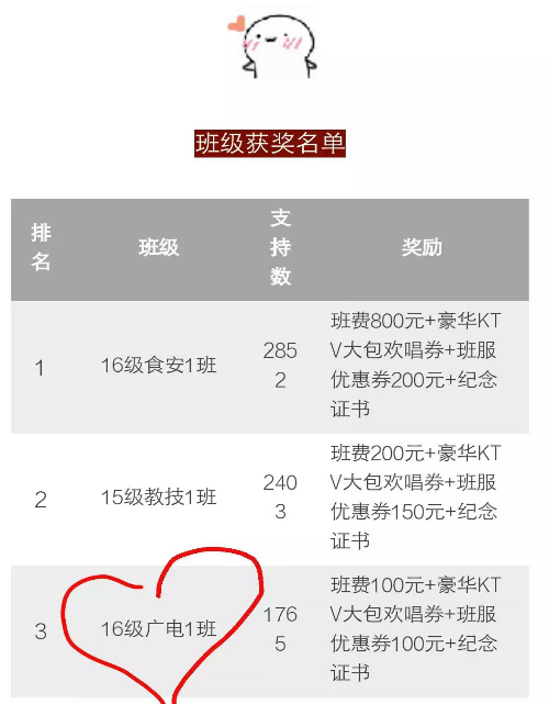 10月12号,广电1601的同学在班长的带领下,进行了最团结班级的拉票活动,文汇路校区、扬子津校区、东关街……都有着同学们的身影。在同学们不懈的坚持下,广电1601班取得了第三名的佳绩。这是同学们共同努力的结果,有利于增强班级的凝聚力。这样的拉票活动,也有利于增强同学们的交际能力。