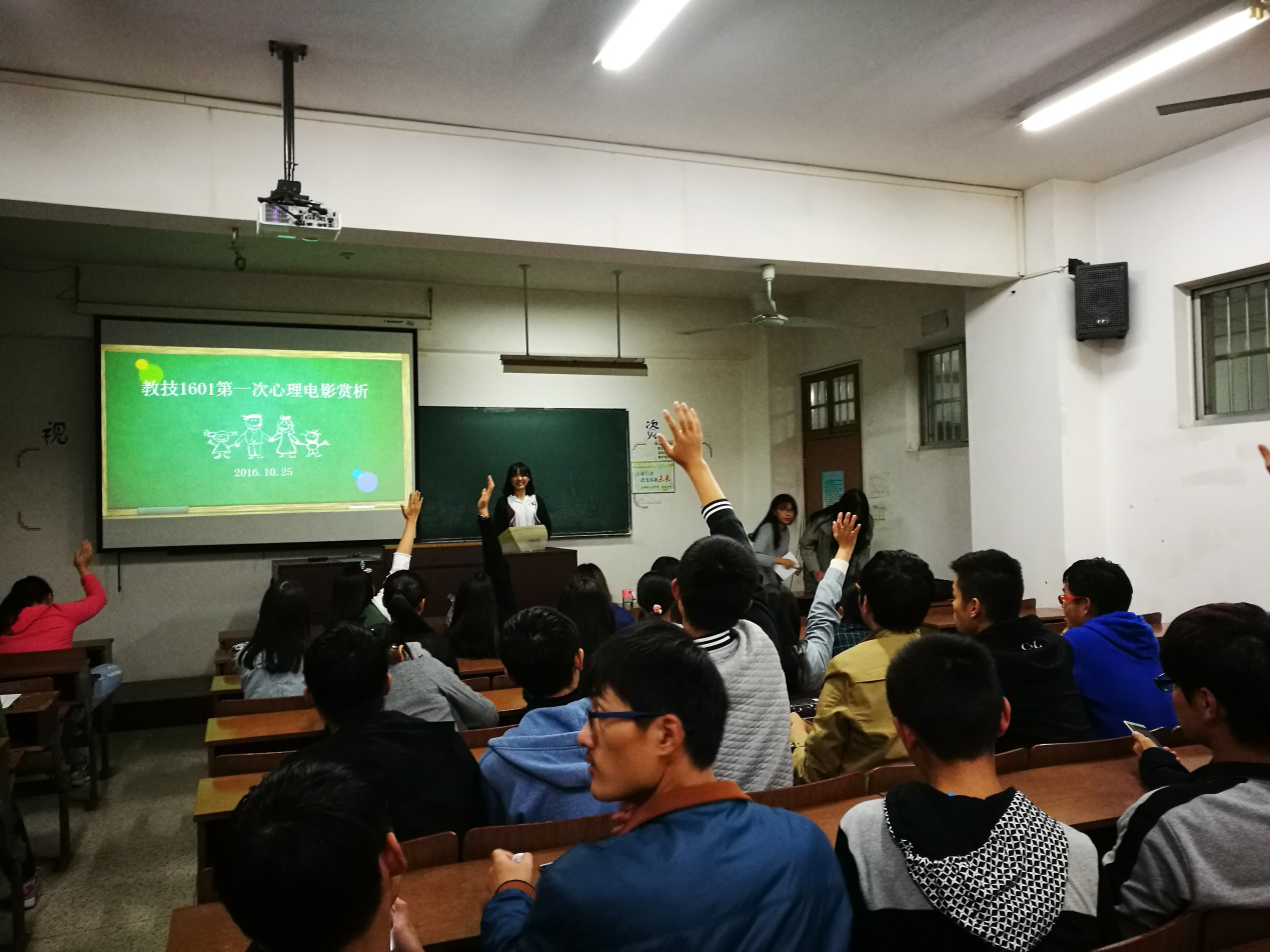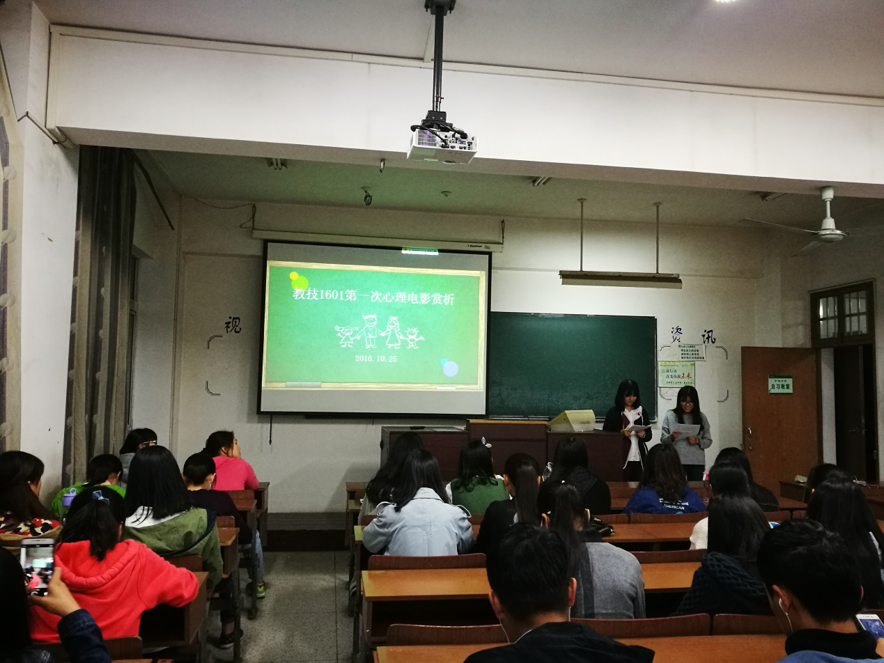 2016年10月25日晚自习,在心理委员的组织下,多个同学的配合加入下,教技1601班在主楼302室进行了心理辅导电影,所有同学都认真的看完了整场电影,班主任邱老师也在座位后面陪我们一同观看,并深有感触,之后负责人又通过有奖问答来给大家送了福利,大家通过这次的心理电影辅导,大家都收获颇多。