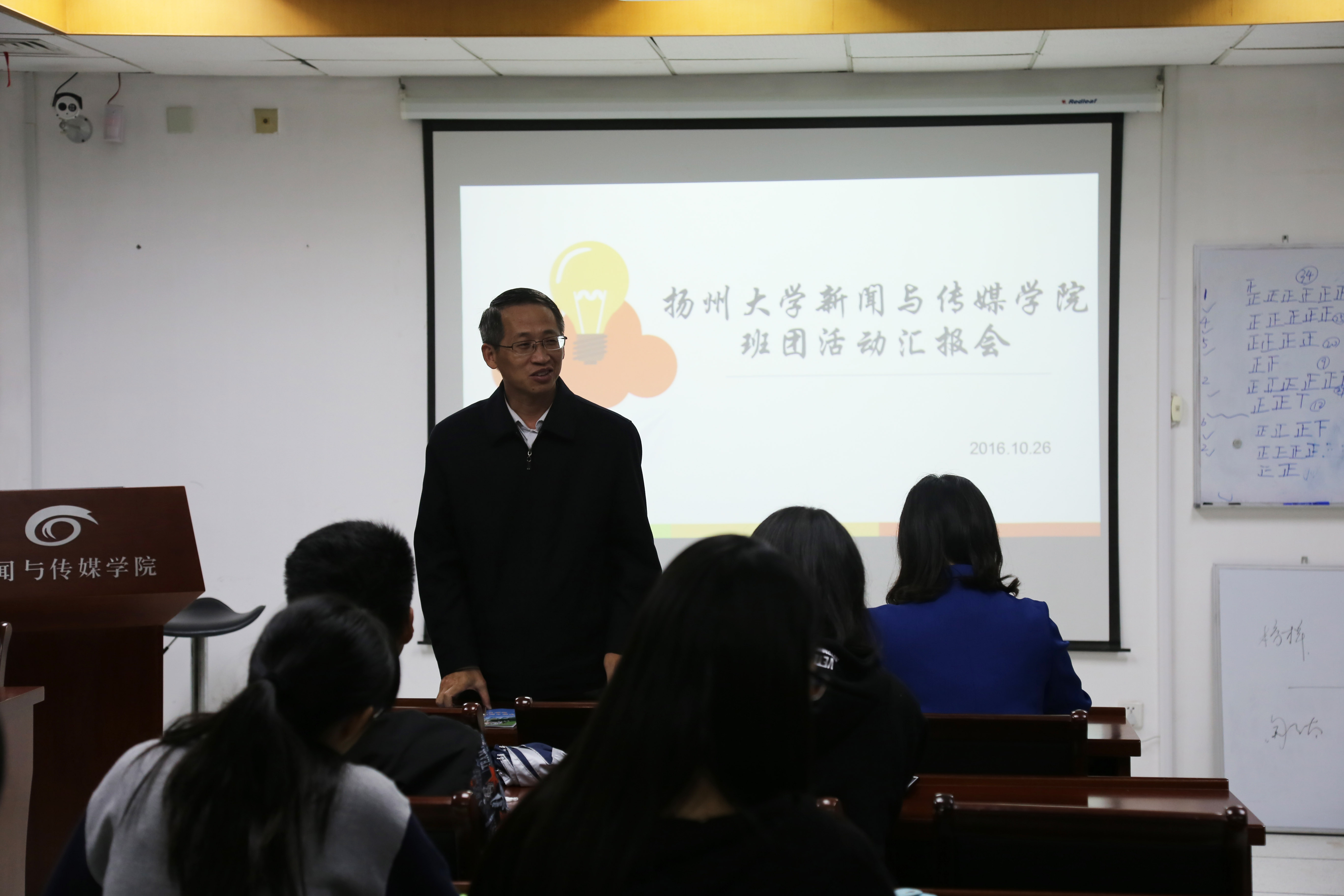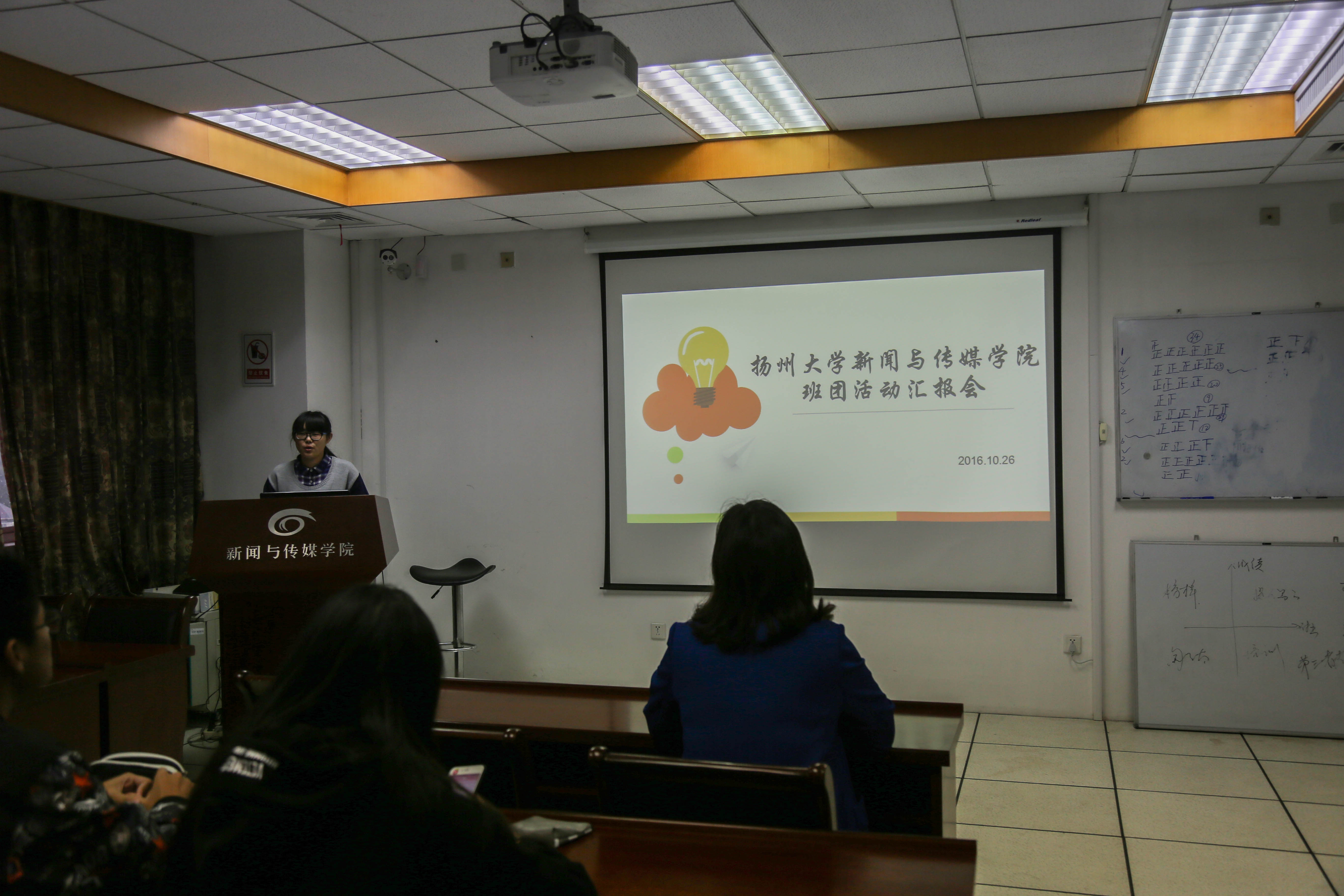 2016年10月26日,新闻与传媒学院2016年1月到9月的班团活动汇报会顺利开展。参加此次汇报会的有戴书记,吴老师和大一至大三各班的班长团支书。由各班班长或团支书上台展示本班的班团活动ppt,ppt展示了各班2016年上半年的班团活动成果。各班举办了丰富多彩、形式各异的班团活动,有观看心理电影、进行英语单词拼写竞赛、组织各式体育竞赛、组织专业采风实践等等。对同学们思想上、学习上、成长上提供了很大的帮助。戴书记对各班班团活动的开展提出了一些建议,吴老师在总结的时候也对各班的班团活动表示了赞许,当然也提出了各班的不足,需要改进之处。各班班长团支书认真记录,确定下半年班团工作方向,表示积极准备下半年班团活动,展现更好的班团风采。