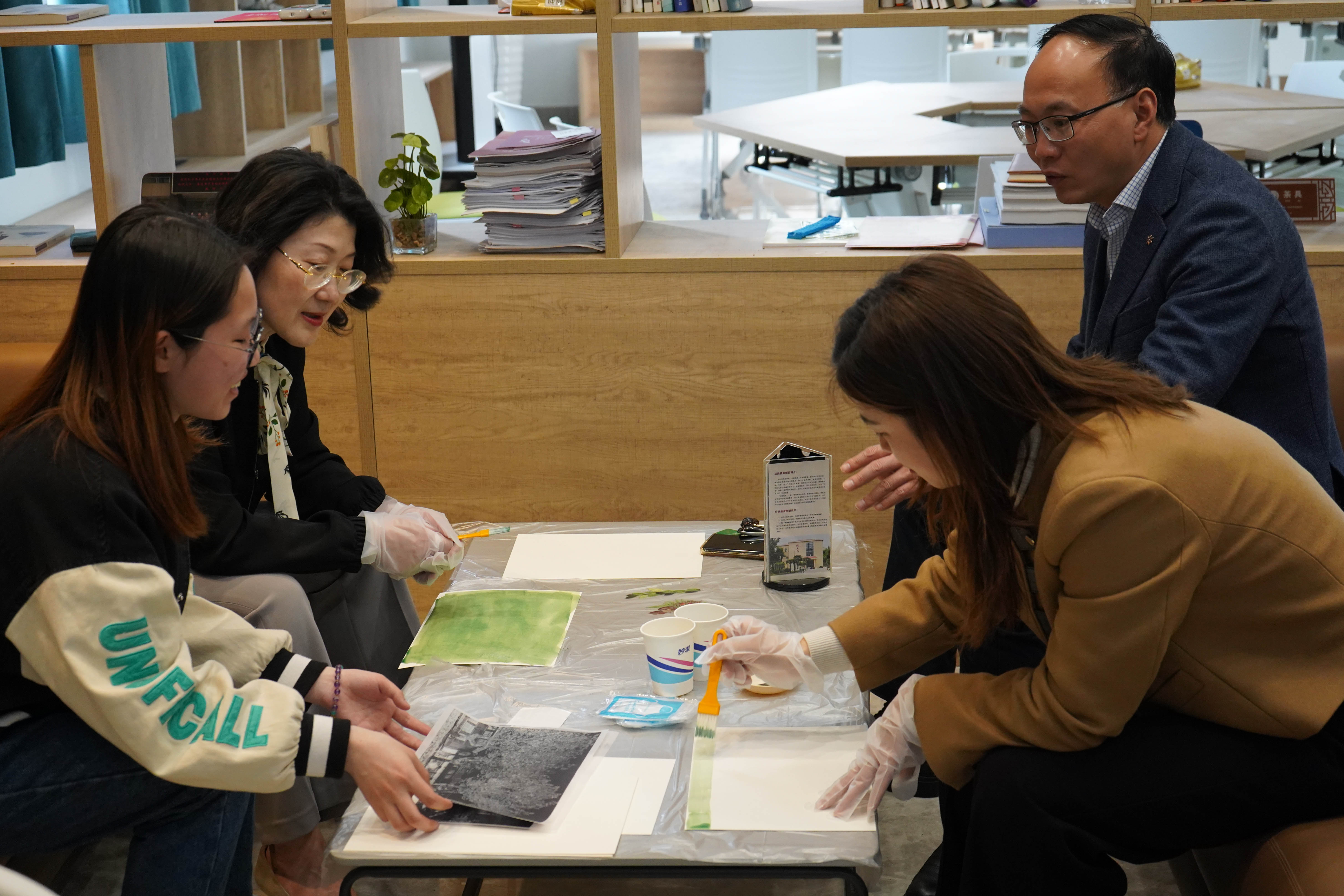 活动现场,老师和同学们在事先准备好的摄影素材基础上,发挥创造能力,在纸张上均匀涂抹显像溶液,拓印上需要的图案,经过晾晒、清洗一整套流程完成后,就能获得类似于照片洗印的图像效果。创作过程中,同学们通过小组互助,激发灵感,经历一次次失败之后成功得到自己的蓝晒作品。参与活动的同学感叹:“亲身参与到劳动之中的乐趣是无穷的,看到自己通过努力打造的作品,内心的获得感和成就感油然而生。”