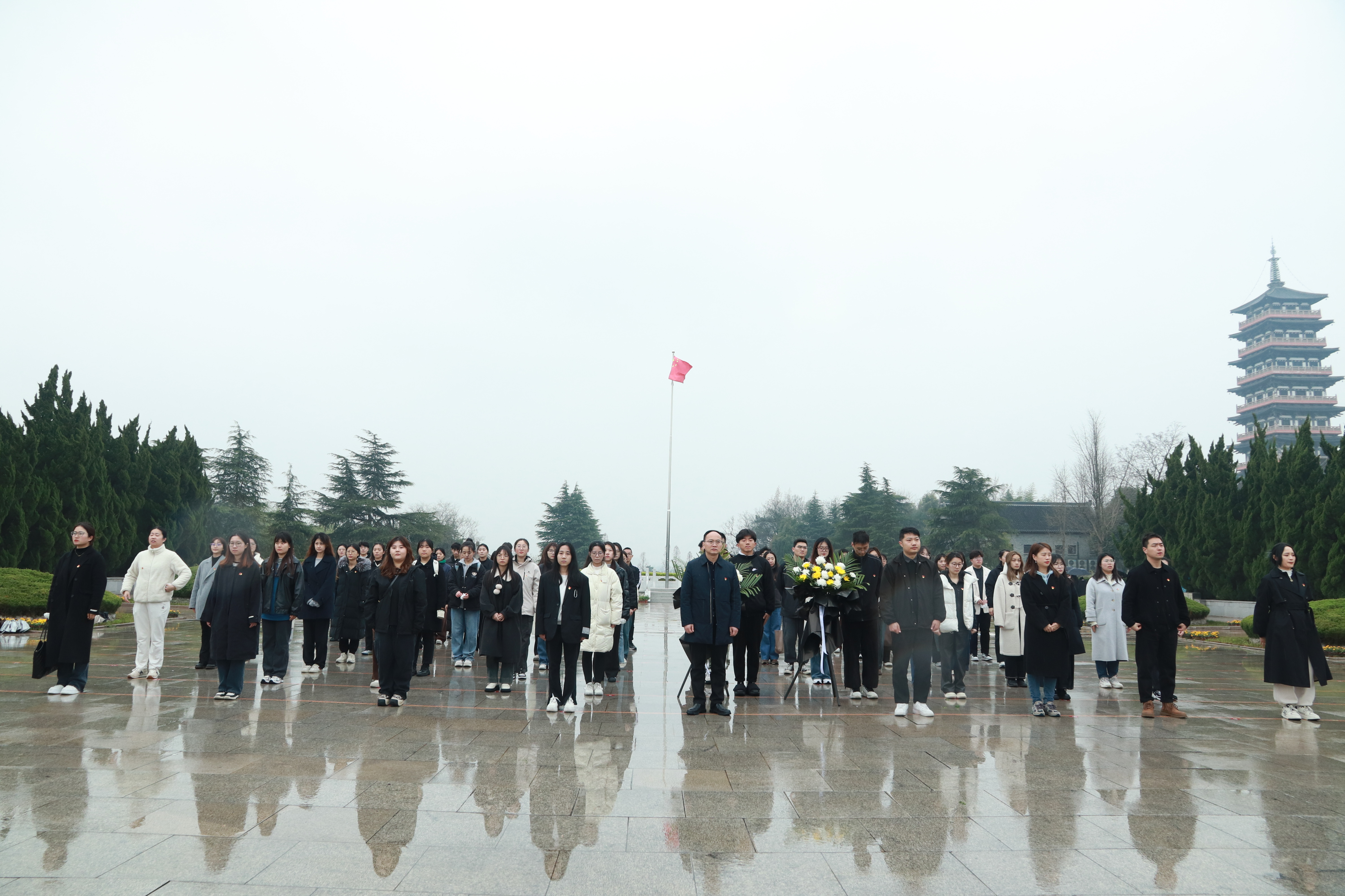 下午三时,天空下起了绵绵细雨,祭扫仪式在庄严的国歌声中拉开帷幕,全体党员肃立默哀。伴随着低沉悲壮的哀乐,党员代表向革命烈士敬献花篮,全体党员向烈士纪念碑敬献亲手制作的小白花,表达对先烈们的崇高敬意。