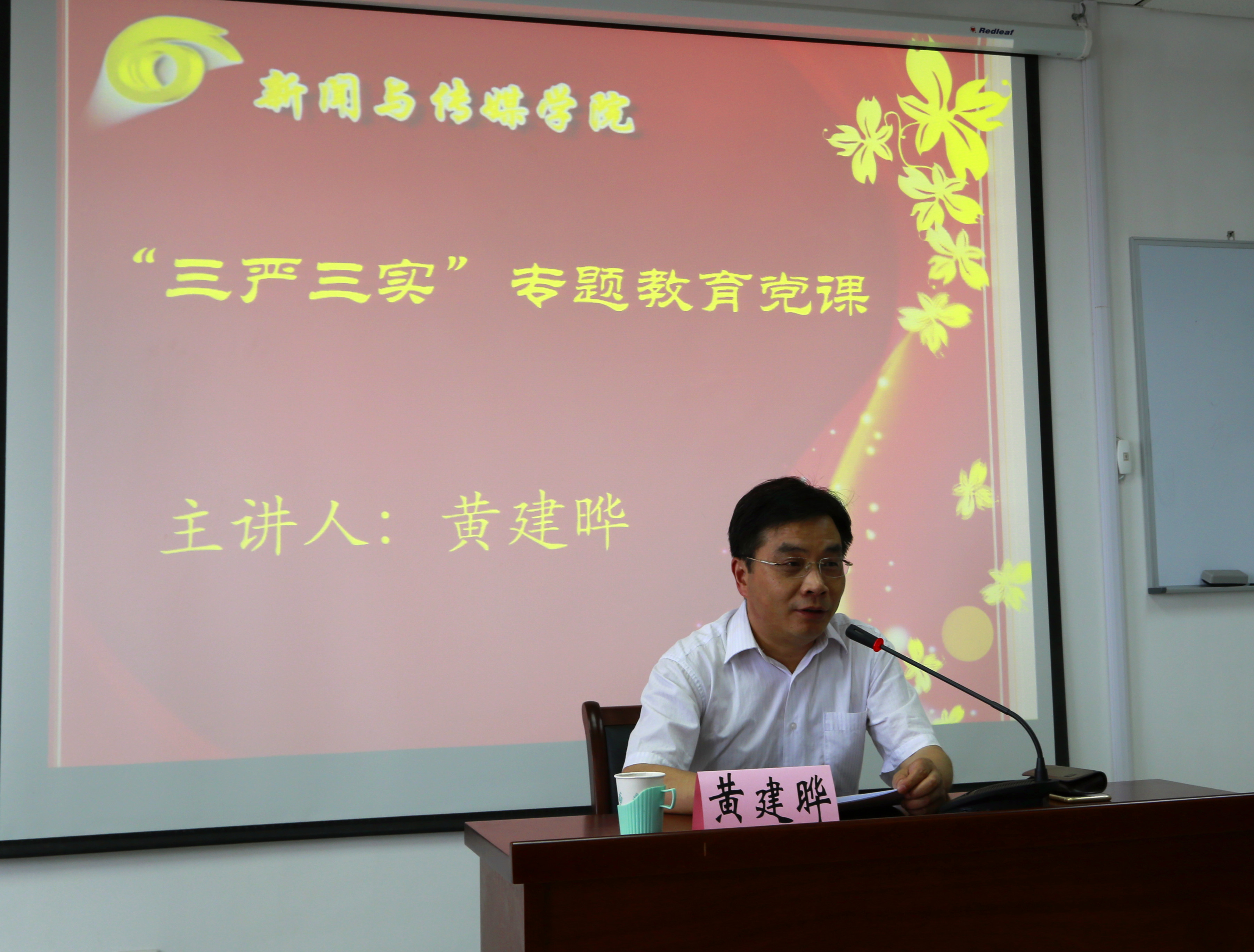 2015年6月10日下午,在教学主楼1113报告厅,校党委常委、副校长黄建晔以“自觉践行‘三严三实’、加快推进事业发展”为题,为我院和科技处、社会合作与服务处以及学报编辑部党员干部讲了一堂深刻而生动的专题党课。院党委书记周斌主持会议。