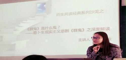 最后的答疑换届,邱奇豪想知道《群鬼》相比较于同期的讽刺型话剧最大的特点是什么?许凌老师答道:“相对于其他作品,群鬼的象征性手法为它增添了独有的魅力。”李梓婧又提出了她的疑惑,对于我们不熟悉戏剧的人来说应当如何读一部戏剧?许凌老师觉得读剧本除了像小说一样的文本阅读外,还要把自己当成这部剧的导演,想着这部剧的舞台呈现。其中剧本的括号里有很多对于人物形象和环境的描述,都是重要的参考。许凌老师耐心细致地回答了所有的问题,让大家对戏剧都产生了浓浓的兴趣。现在,越来越多的人把时间浪费在手机这个小小的屏幕上,却忘了有偌大的书海等着我们去探索,放下手机,拿起书本,一起在“黄金屋” 中徜徉吧。