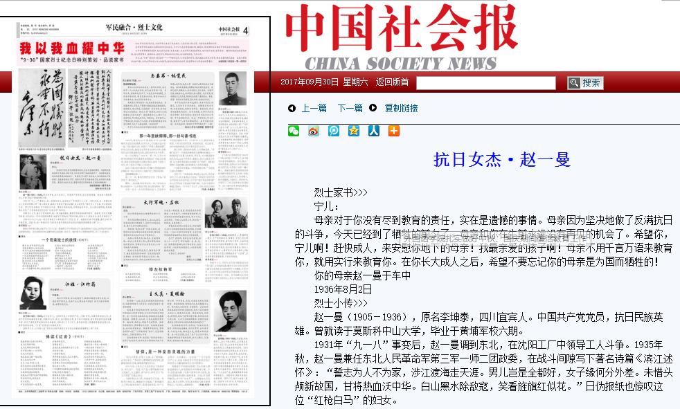 9月30日,在我国第四个国家烈士纪念日到来之际,由国家民政部主办的《中国社会报》推出了“我以我血耀中华 ‘9.30’国家烈士纪念日特别策划•品读家书”纪念专版,其中刊发了我院张爱凤教授、新闻1401班冯倩超同学分别为革命烈士赵一曼、林觉民撰写的祭文《一个母亲战士的抉择》和《那一年意映卿卿,那一封与妻书绝》。