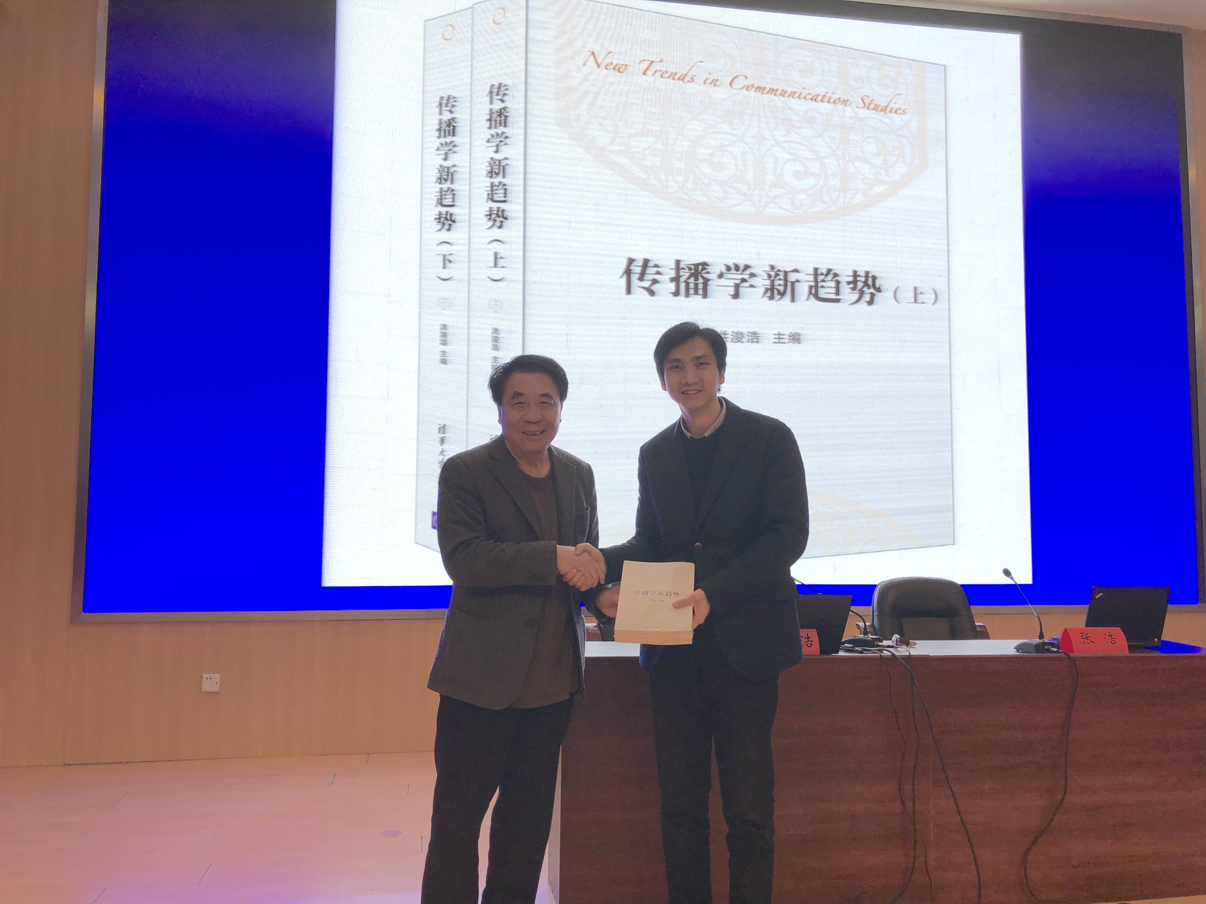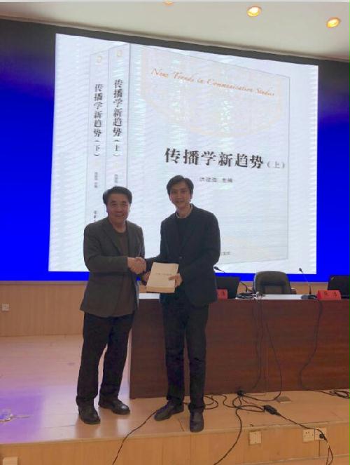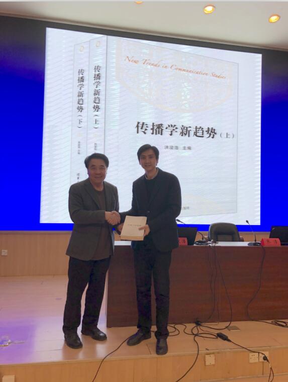 洪教授报告结束后,张浩副院长对报告内容进行了总结,并代表学院接受了洪教授赠予的由其主编的《传播学新趋势》丛书,还对洪教授的到来和讲学再次表示了感谢。同学们也纷纷表示在洪俊浩教授的报告中学到了很多。