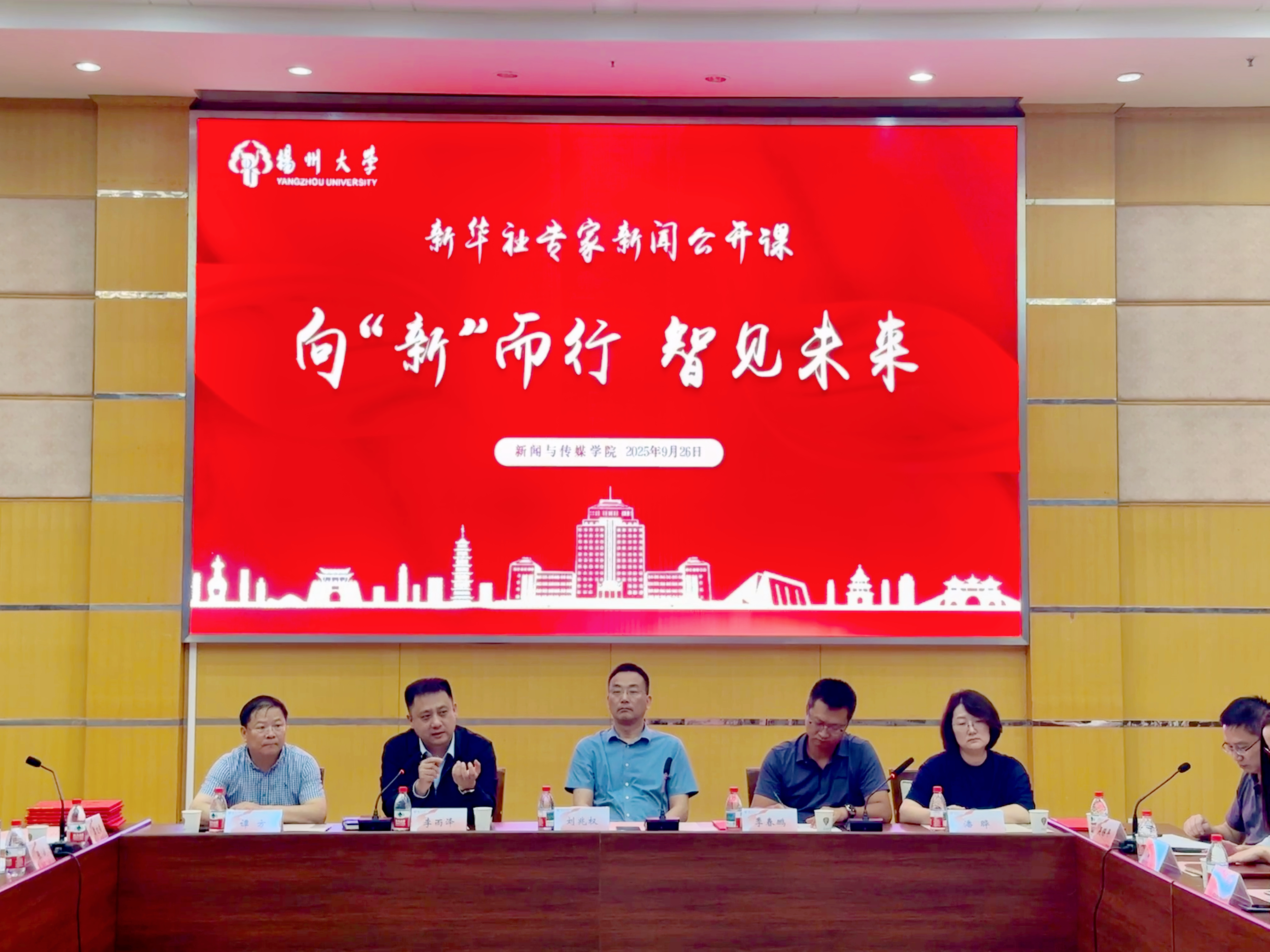 9月26日下午,新华社专家新闻公开课在我校荷花池校区教学主楼二楼多功能厅举行。本次活动以“向‘新’而行,智见未来”为主题,特邀新华社江苏分社党组成员刘兆权,新华社江苏分社总编室编委、图片总监季春鹏,新华社新闻信息江苏中心副主任、新华社客户端江苏频道总编辑李雨泽,新华社江苏分社经济新闻部副主任潘晔,新华社江苏分社办公室行政中心副主任谭方等5位资深行业专家,与师生开展面对面交流。活动开始前,副校长龚卫娟会见了专家一行。