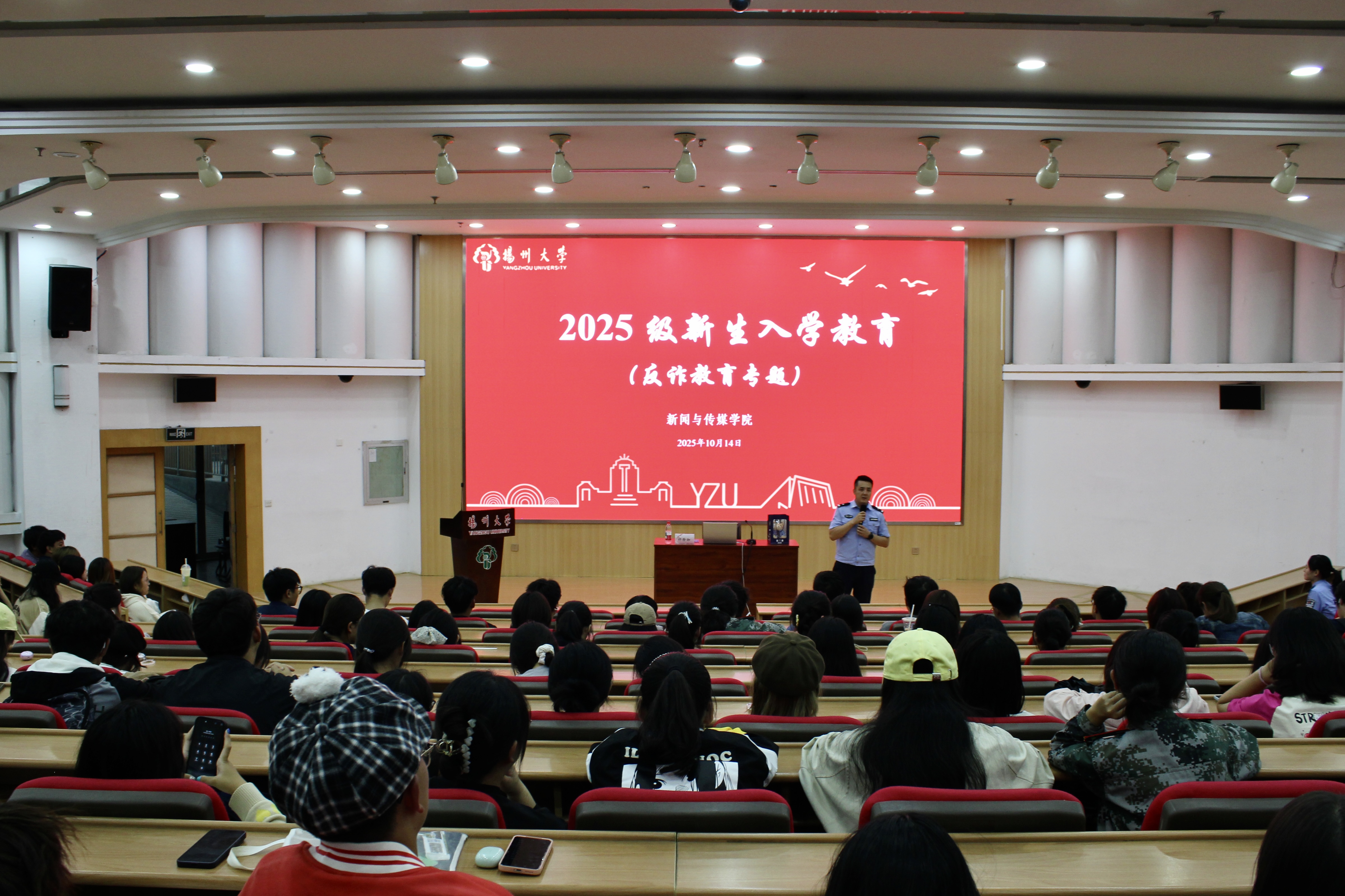 10月14日晚,我院在荷花池校区逸夫馆报告厅举行2025级新生反诈安全教育专题讲座,扬州市公安局经济开发区分局文汇派出所民警王宇、徐军、祁徐珈应邀主讲。